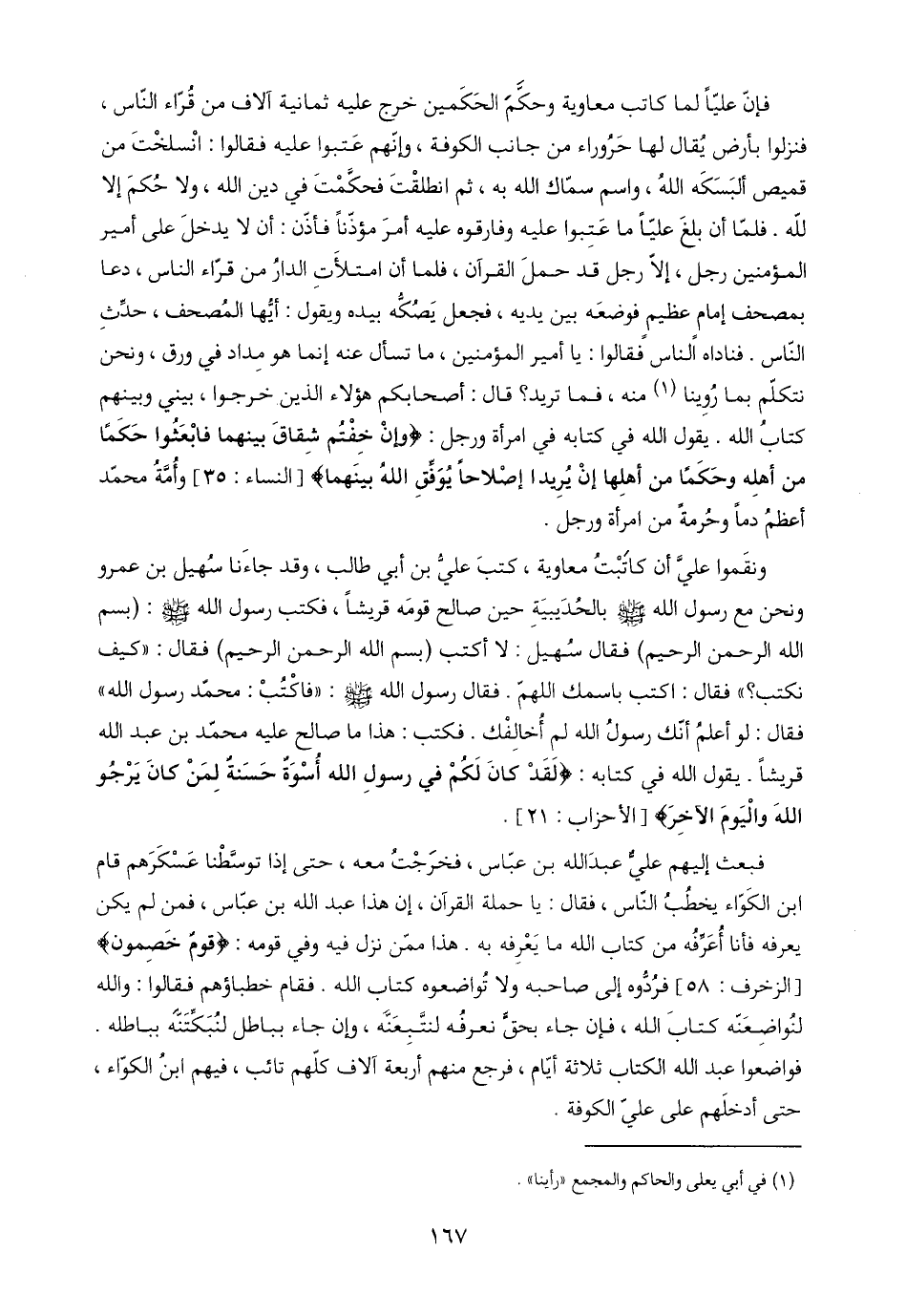 فإنّ عليًّا لما كاتب معاوية وحكَّمَ الحَكَمين خرج عليه ثمانية آلاف من قُرّاء النّاس، فنزلوا بأرض يُقال لها حَرُوراء من جانب الكوفة، وإنّهم عَتبوا عليه فقالوا: انْسلخْتَ من قميص ألبَسَكَه اللَّهُ، واسم سمّاك اللَّه به، ثم انطلقْتَ فحكَّمْتَ في دين اللَّه، ولا حُكمَ إلا للَّه. فلمّا أن بلغَ عليًّا ما عَتِبوا عليه وفارقوه عليه أمرَ مؤذّنًا فأذّن: أن لا يدخلَ على أمير المؤمنين رجل، إلّا رجل قد حملَ القرآن، فلما أن امتلأَتِ الدارُ من قرّاء النّاس، دعا بمصحف إمامٍ عظيمٍ فوضعَه بين يديه، فجعل يَصُكُّه بيده ويقول: أيُّها المُصحف، حدِّثِ النّاس. فناداه النّاس فقالوا: يا أمير المؤمنين، ما تسأل عنه إنما هو مِداد في ورق، ونحن نتكلّم بما رُوِينا (١) منه، فما تريد؟ قال: أصحابكم هؤلاء الذين خرجوا، بيني وبينهم كتابُ اللَّه. يقول اللَّه في كتابه في امرأة ورجل: {وَإِنْ خِفْتُمْ شِقَاقَ بَيْنِهِمَا فَابْعَثُوا حَكَمًا مِنْ أَهْلِهِ وَحَكَمًا مِنْ أَهْلِهَا إِنْ يُرِيدَا إِصْلَاحًا يُوَفِّقِ اللَّهُ بَيْنَهُمَا} [النساء: ٣٥] وأُمَّةُ محمّد أعظمُ دمًا وحُرمةً من امرأة ورجل.