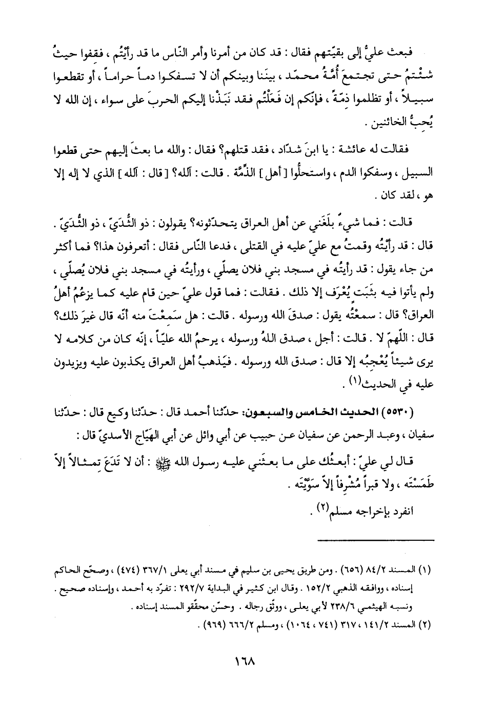 فقالت له عائشة: يا ابنَ شدَاد، فقد قتلهم؟ فقال: واللَّه ما بعثَ إليهم حتى قطعوا السبيل، وسفكوا الدم، واستحلُّوا [أهل] الذِّمَّة. قالت: آللَّه؟ [قال: آللَّه] الذي لا إله إلا هو، لقد كان.