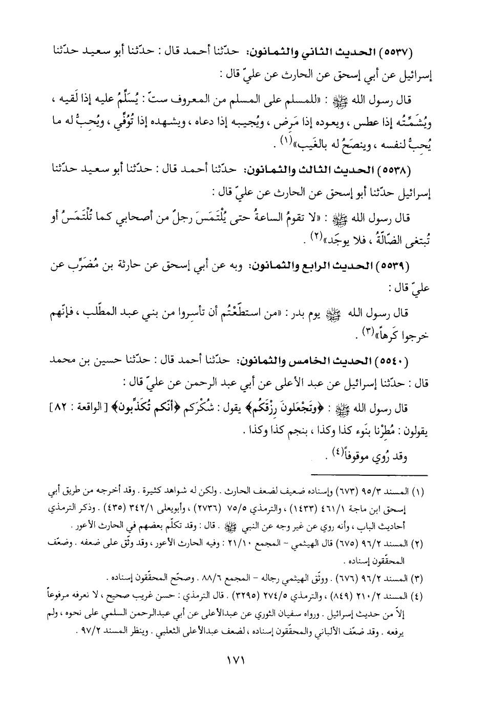 (٥٥٤٠) الحديث الخامس والثمانون: حدّثنا أحمد قال: حدّثنا حسين بن محمد قال: حدّثنا إسرائيل عن عبد الأعلى عن أبي عبد الرحمن عن عليّ قال: