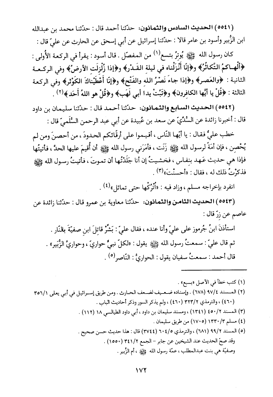 (٥٥٤١) الحديث السادس والثمانون: حدّثنا أحمد قال: حدّثنا محمد بن عبد اللَّه ابن الزُّبير وأسود بن عامر قالا: حدّثنا إسرائيل عن أبي إسحق عن الحارث عن عليّ قال: