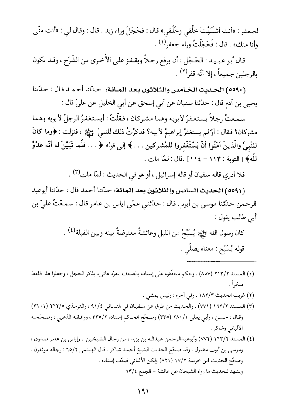 (٣) المسند ٢/ ١٦٢ (٧٧١). والحديث من طرق عن سفيان في النسائي ٤/ ٩١، والترمذي ٥/ ٢٦٢ (٣١٠١) وقال: حسن، وأبي يعلى ١/ ٢٨٠ (٣٣٥) وصحّح الحاكم إسناده ٢/ ٣٣٥، ووافقه الذهبي، وصحّحه الألباني وشاكر.