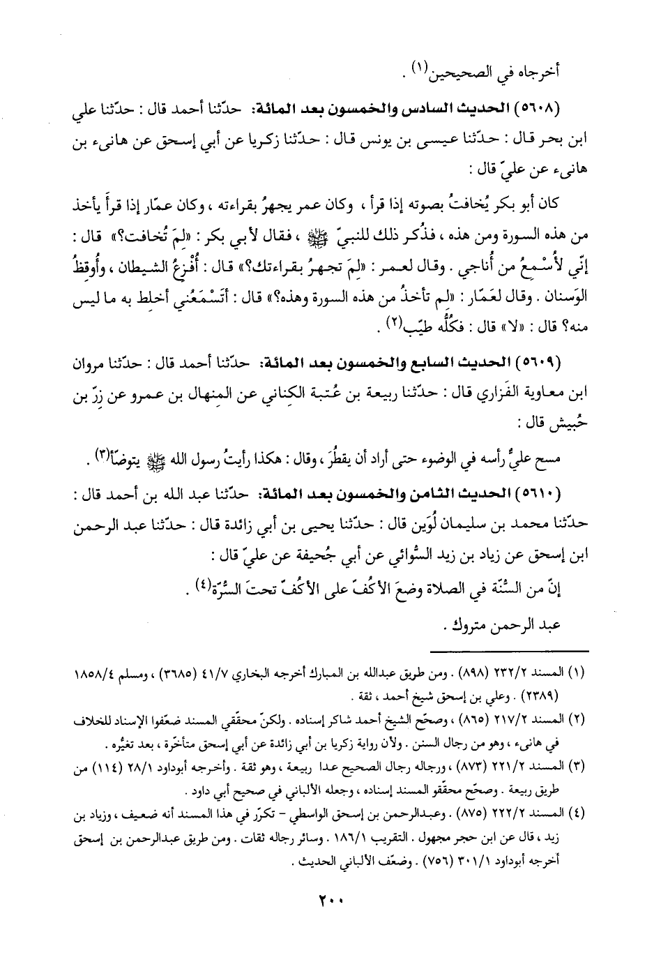 (٥٦٠٨) الحديث السادس والخمسون بعد المائة: حدّثنا أحمد قال: حدّثنا علي ابن بحر قال: حدّثنا عيسى بن يونس قال: حدّثنا زكريا عن أبي إسحق عن هانىء بن هانىء عن عليّ قال: