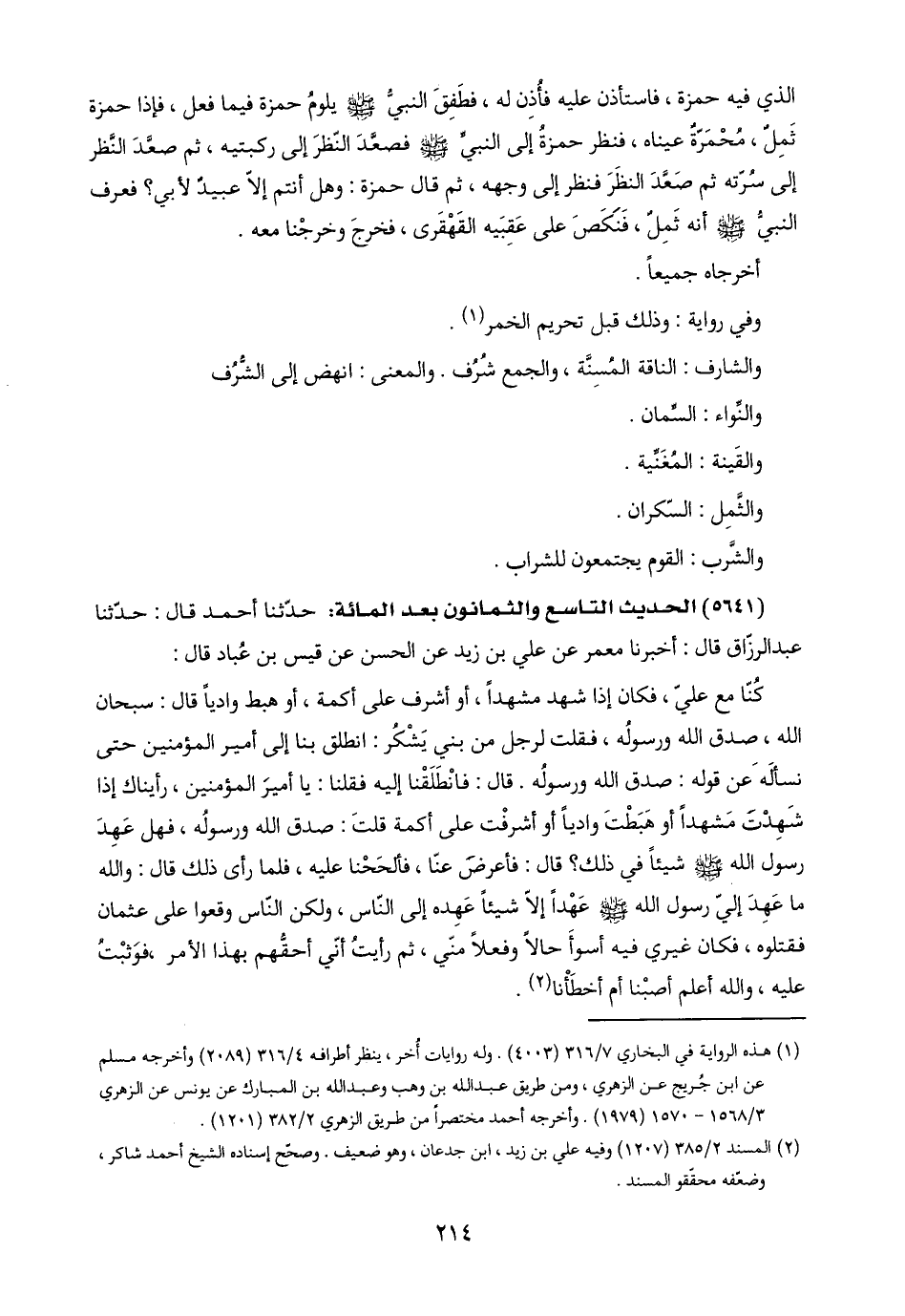 الذي فيه حمزة، فاستأذن عليه فأُذِن له، فطَفِقَ النبيُّ -صلى اللَّه عليه وسلم- يلومُ حمزة فيما فعل، فإذا حمزة ثَمِلٌ، مُحْمَرّةٌ عيناه، فنظر حمزةُ إلى النبيِّ -صلى اللَّه عليه وسلم- فصعَّدَ النّظرَ إلى ركبتيه، ثم صعَّدَ النَّظر إلى سُرّته ثم صَعَّدَ النظَرَ فنظر إلى وجهه، ثم قال حمزة: وهل أنتم إلّا عبيدٌ لأبي؟ فعرف النبيُّ -صلى اللَّه عليه وسلم- أنّه ثَمِلٌ، فَنَكَصَ على عَقِبَيه القَهْقَرى، فخرجَ وخرجْنا معه.