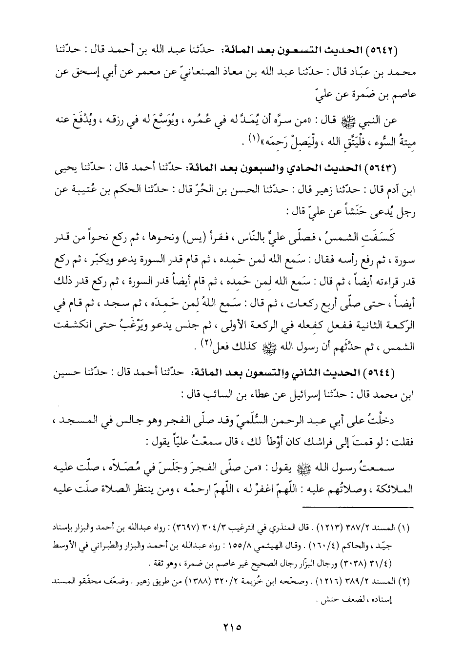 (٥٦٤٢) الحديث التسعون بعد المائة: حدّثنا عبد اللَّه بن أحمد قال: حدّثنا محمد بن عبّاد قال: حدّثنا عبد اللَّه بن معاذ الصنعانيّ عن معمر عن أبي إسحق عن عاصم بن ضَمرة عن عليّ:
