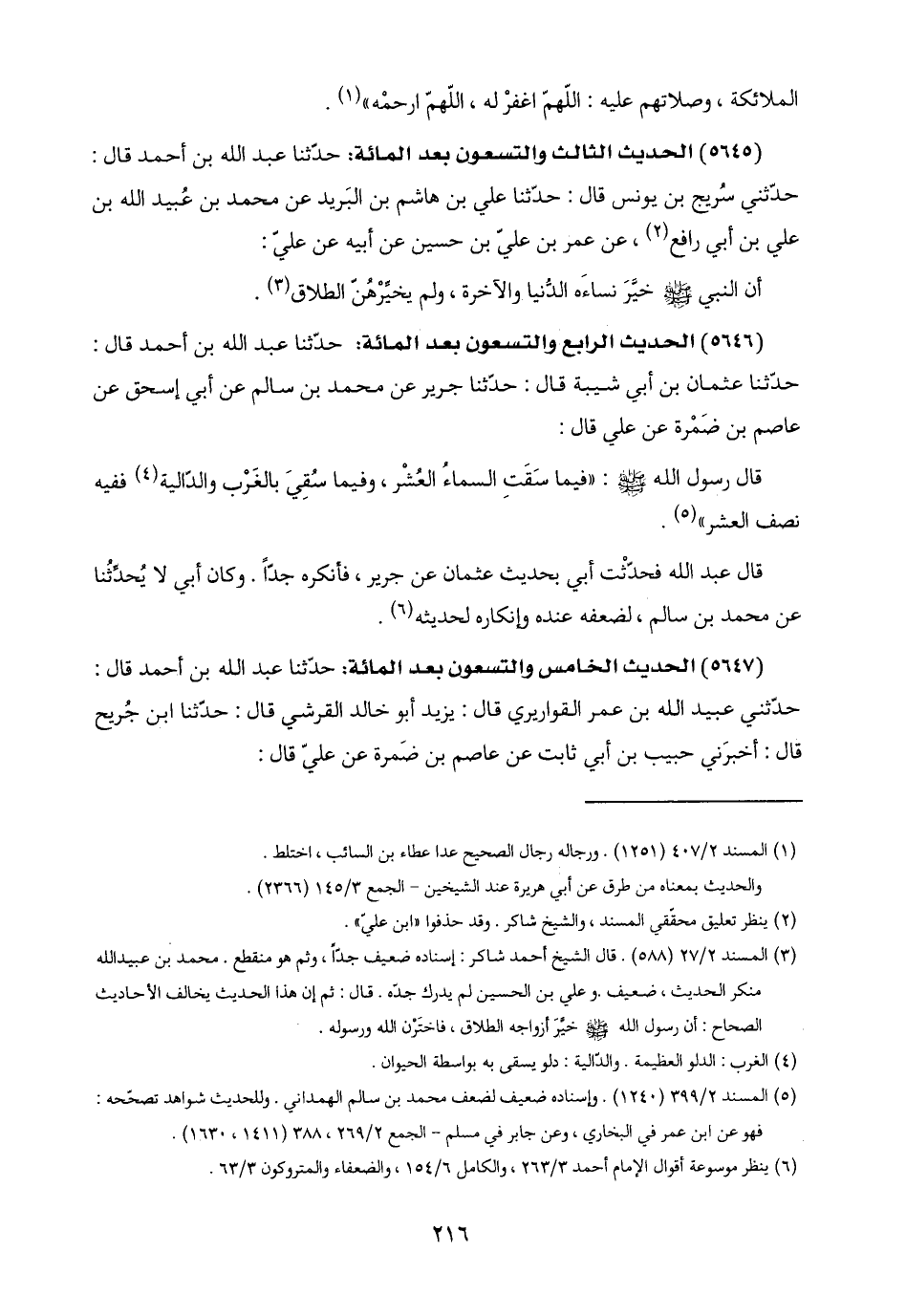 (٥٦٤٦) الحديث الرابع والتسعون بعد المائة: حدّثنا عبد اللَّه بن أحمد قال: حدّثنا عثمان بن أبي شيبة قال: حدّثنا جرير عن محمد بن سالم عن أبي إسحق عن عاصم بن ضَمْرة عن علي قال: