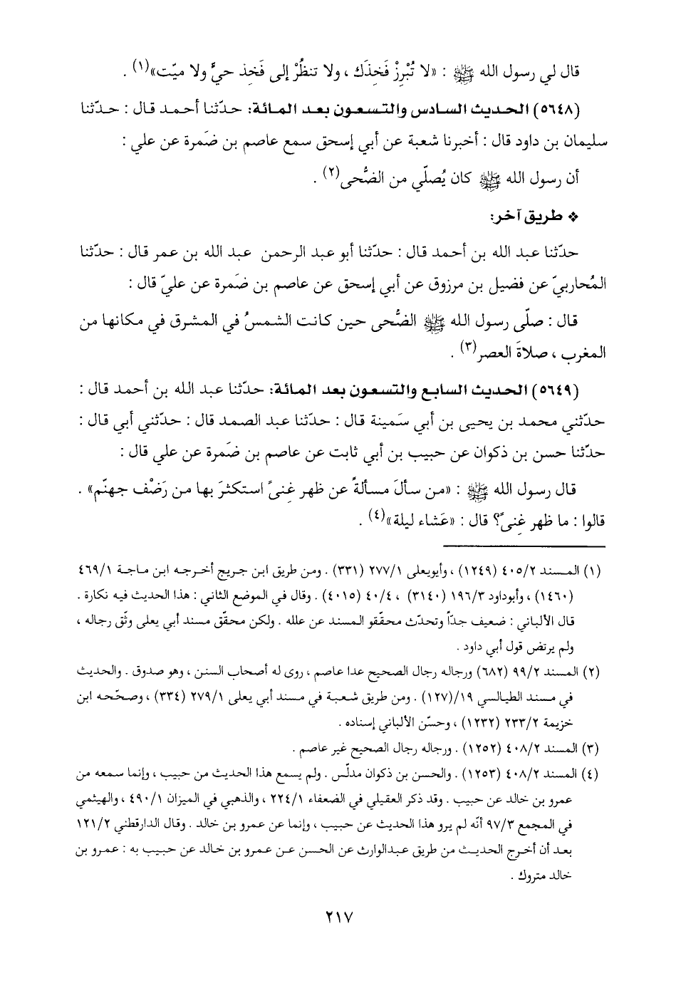 (٥٦٤٩) الحديث السابع والتسعون بعد المائة: حدّثنا عبد اللَّه بن أحمد قال: حدّثني محمد بن يحيى بن أبي سَمينة قال: حدّثنا عبد الصمد قال: حدّثني أبي قال: حدّثنا حسن بن ذكوان عن حبيب بن أبي ثابت عن عاصم بن ضَمرة عن علي قال: