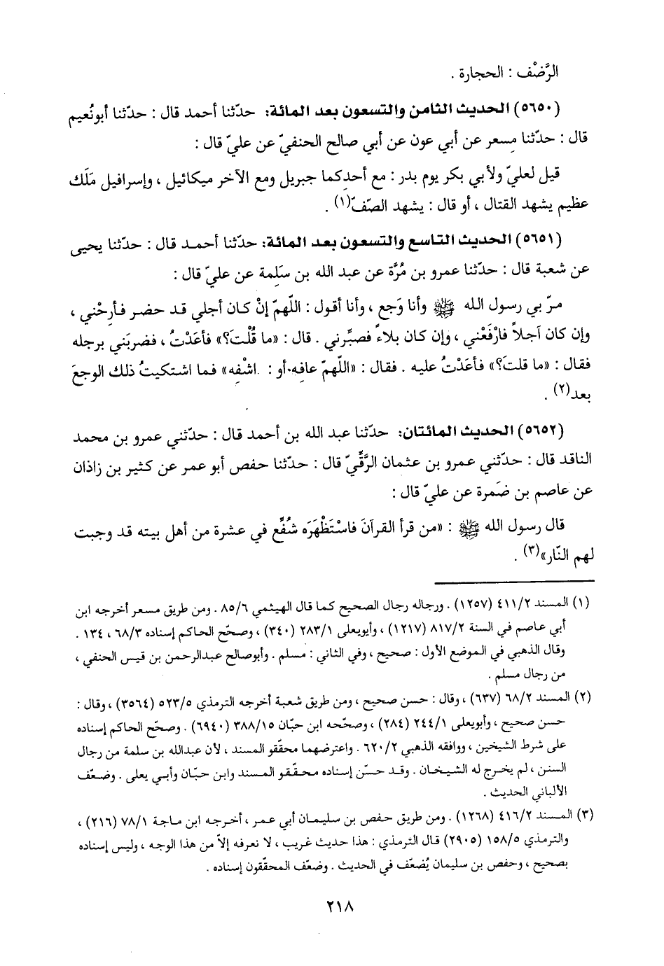 (٥٦٥٢) الحديث المائتان: حدّثنا عبد اللَّه بن أحمد قال: حدّثني عمرو بن محمد الناقد قال: حدّثني عمرو بن عثمان الرَّقِّيّ قال: حدّثنا حفص أبو عمر عن كثير بن زاذان عن عاصم بن ضَمرة عن عليّ قال:
