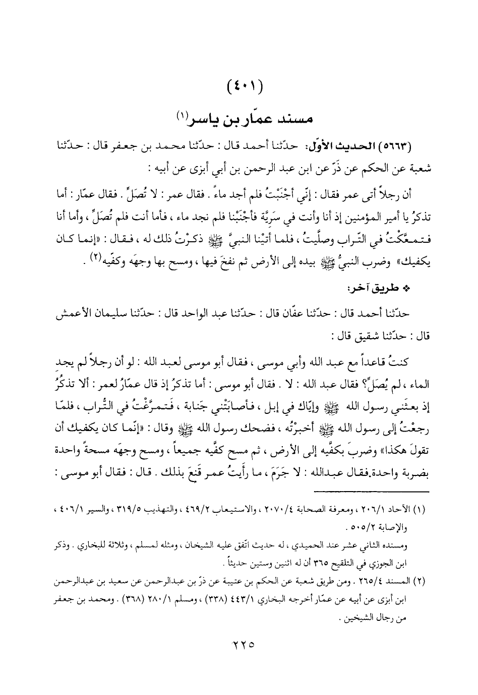 (٢) المسند ٤/ ٢٦٥. ومن طريق شعبة عن الحكم بن عتيبة عن ذرّ بن عبد الرحمن عن سعيد بن عبد الرحمن ابن أبزى عن أبيه عن عمّار أخرجه البخاري ١/ ٤٤٣ (٣٣٨)، ومسلم ١/ ٢٨٠ (٣٦٨). ومحمد بن جعفر من رجال الشيخين.