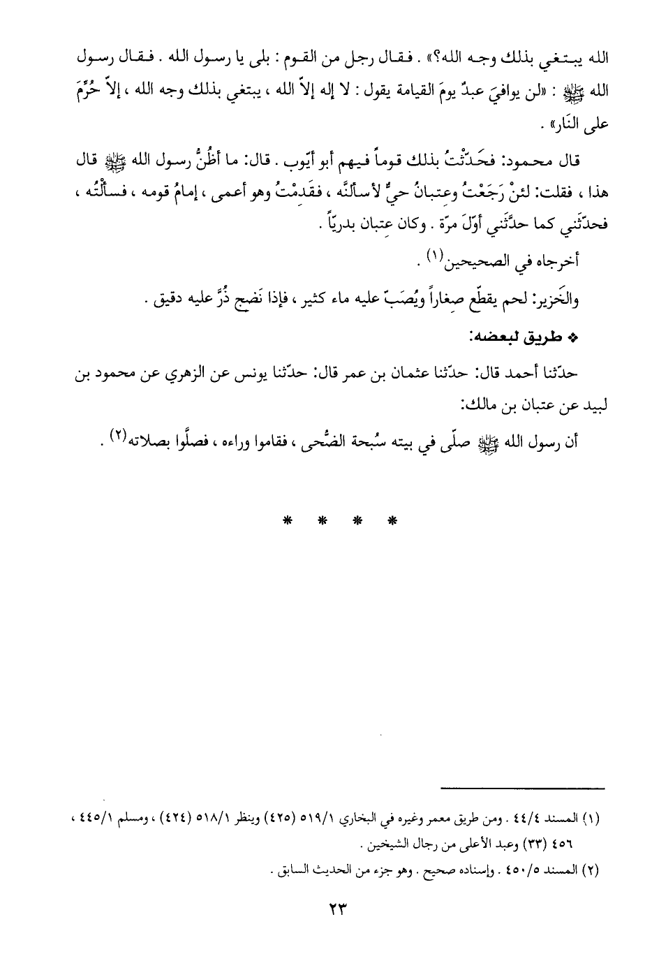 قال محمود: فحَدّثْتُ بذلك قومًا فيهم أبو أيّوب. قال: ما أظُنُّ رسول اللَّه -صلى اللَّه عليه وسلم- قال هذا، فقلت: لئنْ رَجَعْتُ وعِتبانُ حيٌّ لأسألنَّه، فقَدِمْتُ وهو أعمى، إمامُ قومه، فسألْتُه، فحدّثَني كما حدَّثَني أوّلَ مرّة. وكان عِتبان بدريًّا.