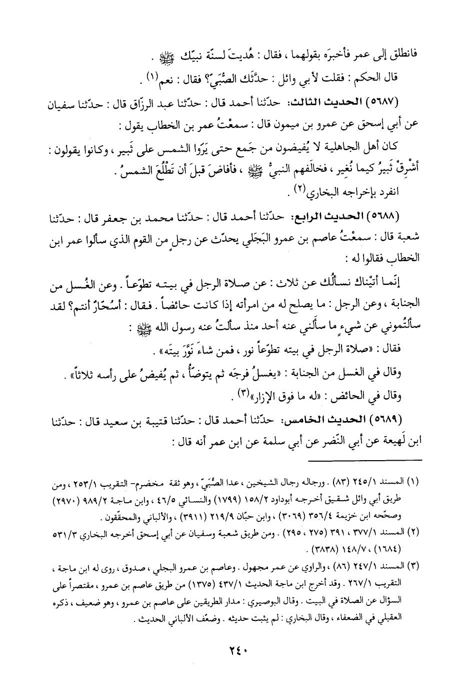 (٥٦٨٨) الحديث الرابع: حدّثنا أحمد قال: حدّثنا محمد بن جعفر قال: حدّثنا شعبة قال: سمعْتُ عاصم بن عمرو البَجَلي يحدّث عن رجلٍ من القوم الذي سألوا عمر ابن الخطاب فقالوا له: