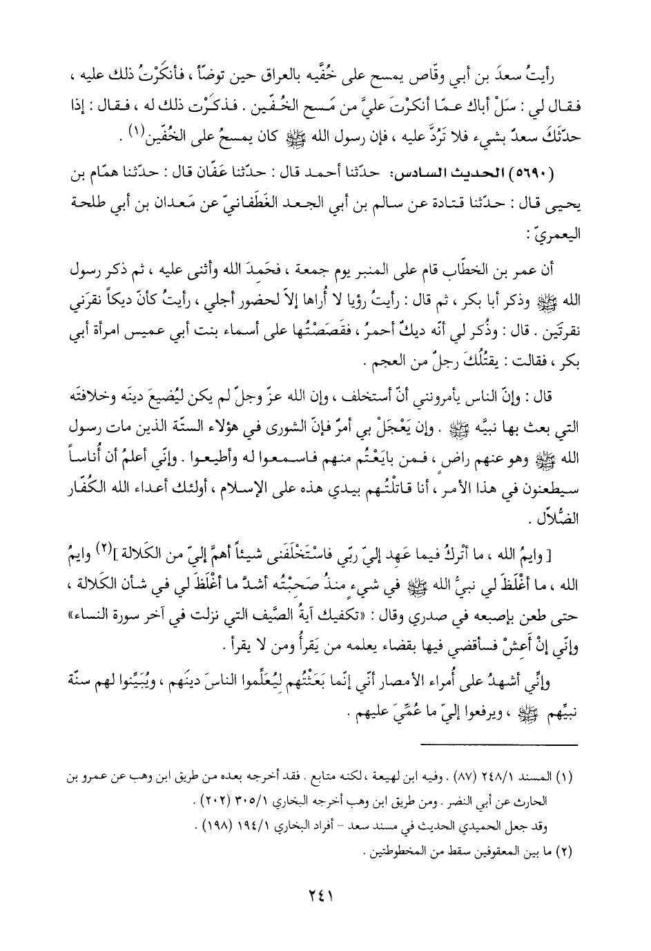 رأيتُ سعدَ بن أبي وقّاص يمسح على خُفَّيه بالعراق حين توضّأ، فأنكَرْتُ ذلك عليه، فقال لي: سَلْ أباك عمّا أنكرْتَ عليَّ من مَسح الخُفّين. فذكَرْت ذلك له، فقال: إذا حدّثَكَ سعدٌ بشيء فلا تَرُدَّ عليه، فإن رسول اللَّه -صلى اللَّه عليه وسلم- كان يمسحُ على الخُفّين (١).
