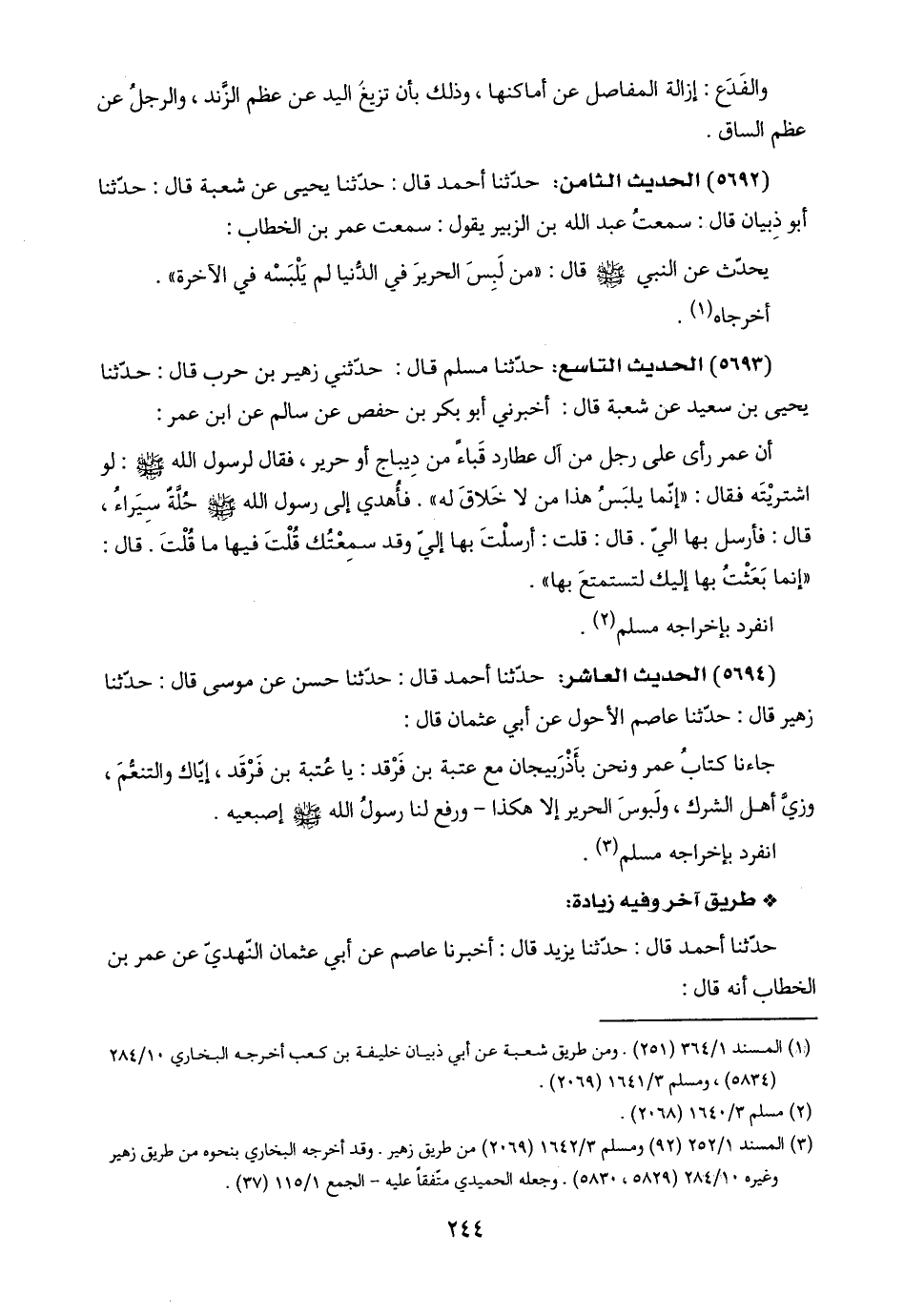 (٣) المسند ١/ ٢٥٢ (٩٢) ومسلم ٣/ ١٦٤٢ (٢٠٦٩) من طريق زهير. وقد أخرجه البخاري بنحوه من طريق زهير وغيره ١٠/ ٢٨٤ (٥٨٢٩، ٥٨٣٠). وجعله الحميدي متّفقًا عليه - الجمع ١/ ١١٥ (٣٧).