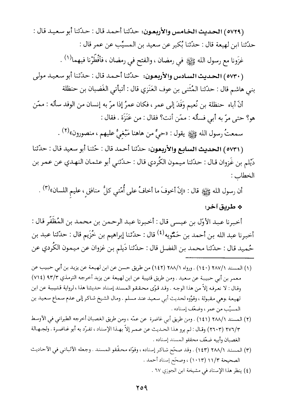 (٢) المسند ١/ ٢٨٨ (١٤١). ومن طريق أبي غاضرة عن عمّه، ومن طريق الغصبان أخرجه الطبراني في الأوسط ٣/ ٢٧٦ (٢٦٠٣) وقال: لم يرو هذا الحديث عن عمر إلّا بهذا الإسناد، تفرّد به أبو غاضرة. ولجهالة الغصبان وأبيه ضعّف محقّقو المسند إسناده.