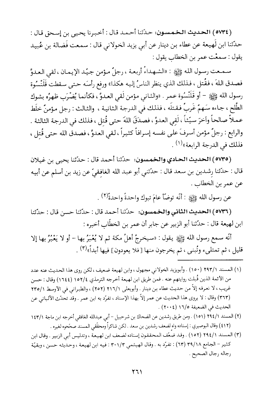 (٣) المسند ١/ ٢٩٤ (١٥٢). وقد ضعّف المحقّقون إسناده لضعف ابن لهيعة، وتدليس أبي الزبير. وقال ابن كثير - الجامع ١٨/ ٣٩ (٦٣): تفرّد به. وقال الهيثمي ٣/ ٣٠١: فيه ابن لهيعة، وحديثه حسن، وبقيّة رجاله رجال الصحيح.