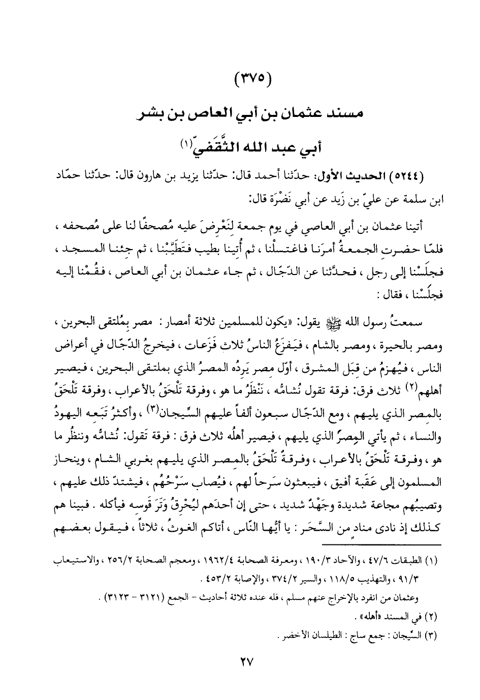 (٣٧٥) مسند عثمان بن أبي العاص بن بشر أبي عبد اللَّه الثَّقَفيّ (١)