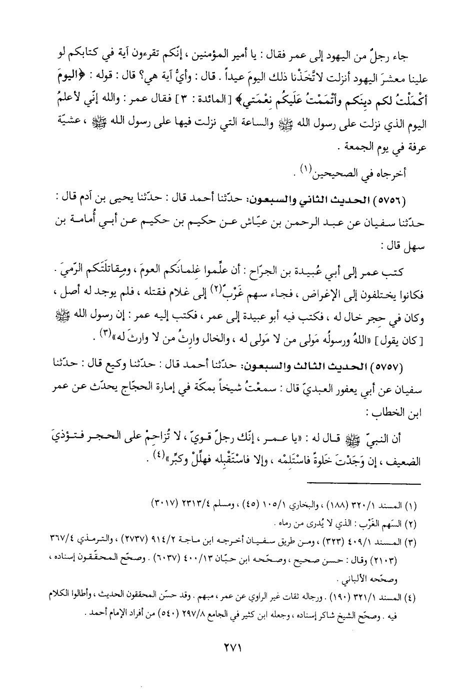 (٤) المسند ١/ ٣٢١ (١٩٠). ورجاله ثقات غير الراوي عن عمر، مبهم. وقد حسّن المحقّقون الحديث، وأطالوا الكلام فيه. وصحّح الشيخ شاكر إسناده، وجعله ابن كثير في الجامع ٨/ ٢٩٧ (٥٤٠) من أفراد الإمام أحمد.