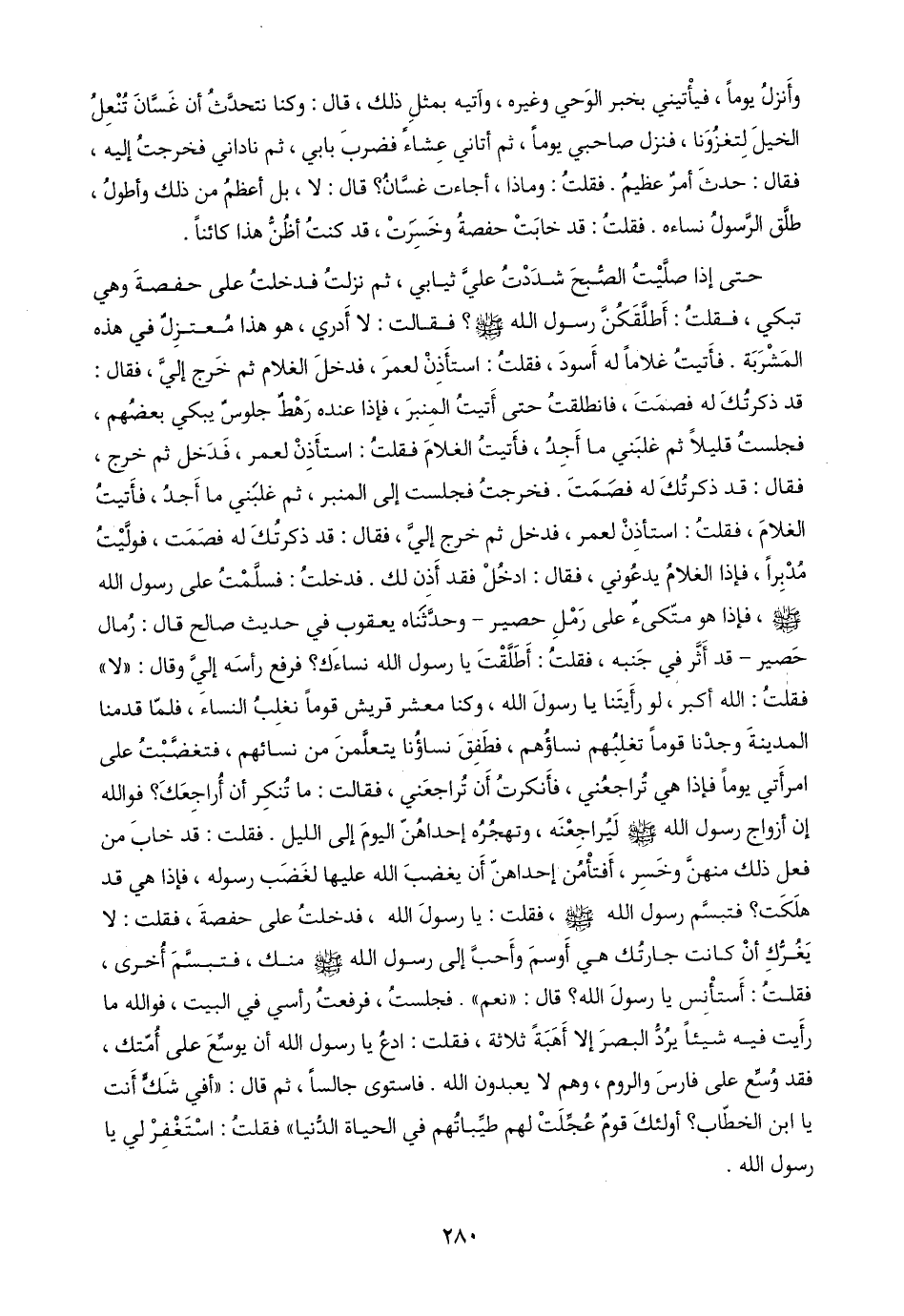 حتى إذا صلَّيْتُ الصُّبحَ شدَدْتُ عليَّ ثيابي، ثم نزلتُ فدخلتُ على حفصةَ وهي تبكي، فقلتُ: أَطلَّقَكُنَّ رسول اللَّه -صلى اللَّه عليه وسلم-؟ فقالت: لا أَدري، هو هذا مُعتزِلٌ في هذه المَشْرَبَة. فأَتيتُ غلامًا له أَسودَ، فقلتُ: استأَذِنْ لعمرَ، فدخلَ الغلام ثم خَرج إليَّ، فقال: قد ذكرتُكَ له لمحصضَتَ، فانطلقتُ حتى أَتيتُ المِنبرَ، فإذا عنده رَهْطٌ جلوسٌ يبكي بعضُهم، فجلستُ قليلًا تم غلبَني ما أَجِدُ، فأَتيتُ الغلامَ فقلتُ: استأَذِنْ لعمر، فَدَخل ثم خرج، فقال: قد ذكرتُكَ له فصَمَتَ. فخرجتُ فجلست إلى المنبر، ثم غلبَني ما أَجدُ، فأَتيتُ الغلامَ، فقلتُ: استأذِنْ لعمر، فدخل ثم خرج إليَّ، فقال: قد ذكرتُكَ له فصَمَت، فولَّيْتُ مُدْبِرًا، فإذا الغلامُ يدعُوني، فقال: ادخُلْ فقد أَذِن لك. فدخلتُ: فسلَّمْتُ على رسول اللَّه -صلى اللَّه عليه وسلم-، فإذا هو متّكىءٌ على رَمْلِ حصير -وحدَّثَناه يعقوب في حديث صالح قال: رُمال حَصير- قد أَثَّر في جَنبه، فقلتُ: أَطَلَّقْتَ يا رسول اللَّه نساءَك؟ فرفع رأسَه إليَّ وقال: "لا" فقلتُ: اللَّه أكبر، لو رأَيتَنا يا رسولَ اللَّه، وكنا معشر قريش قومًا نغلِبُ النساءَ، فلمّا قدمنا المدينةَ وجدْنا قومًا تغلِبُهم نساؤُهم، فطَفِقَ نساؤُنا يتعلَّمنَ من نسائهم، فتغضَّبْتُ على امرأَتي يومًا فإذا هي تُراجعُني، فأَنكرتُ أَن تُراجعَني، فقالت: ما تُنكِر أن أُراجِعَكَ؟ فواللَّه إنّ أزواج رسول اللَّه -صلى اللَّه عليه وسلم- ليُراجِعْنَه، وتهجُرُه إحداهُنّ اليومَ إلى الليل. فقلت: قد خابَ من فعل ذلك منهنَّ وخَسِر، أَفتأْمُن إحداهنّ أَن يغضبَ اللَّه عليها لغَضَب رسوله، فإذا هي قد هلَكَت؟ فتبسَّم رسول اللَّه -صلى اللَّه عليه وسلم-، فقلت: يا رسولَ اللَّه، فدخلتُ على حفصةَ، فقلت: لا يَغُرُّكِ أنْ كانت جارتُك هي أَوسمَ وأَحبَّ إلى رسول اللَّه -صلى اللَّه عليه وسلم- منك، فتبسَّمَ أُخرى، فقلتُ: أَستأْنِس يا رسولَ اللَّه؟ قال: "نعم". فجلستُ، فرفعتُ رأسي في البيت، فواللَّه ما رأَيت فيه شيئًا يرُدُّ البصرَ إلا أَهَبَةً ثلاثة، فقلت: ادعُ يا رسول اللَّه أن يوسِّعَ أُمّتك، فقد وُسِّع على فارسَ والروم، وهم لا يعبدون اللَّه. فاستوى جالسًا، ثم قال: "أفي شَكٍّ أَنت يا ابن الخطّاب؟ أولئكَ قومٌ عُجِّلَتْ لهم طيِّباتُهم في الحياة الدُّنيا" فقلتُ: اسْتَغْفِرْ لي يا رسول اللَّه.