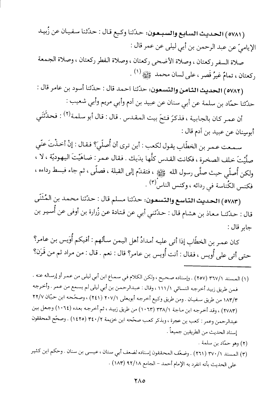 (١) المسند ١/ ٣٦٧ (٢٥٧). وإسناده صحيح، ولكن الكلام في سماع ابن أبي ليلى من عمر أو إرساله عنه. فمن طريق زبيد أخرجه النسائي ١/ ١١١، وقال: عبد الرحمن بن أبي ليلى لم يسمع من عمر. وأخرجه ٣/ ١٨٣ من طريق سفيان. ومن طريق وكيع أخرجه أبو يعلى ١/ ٢٠٧ (٢٤١)، وصحّحه ابن حبّان ٧/ ٢٢ (٢٧٨٣)، وقد أخرجه ابن ماجة ١/ ٣٣٨ (١٠٦٣) من طريق زبيد، ثم أخرجه بعده (١٠٦٤) وجعل بين عبد الرحمن وعمر: كعب بن عجرة، وبذكر كعب صحّحه ابن خزيمة ٢/ ٣٤٠ (١٤٢٥). وصحّح المحقّقون إسناد الحديث من الطريقين جميعًا.