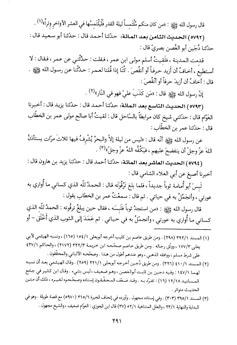 (٥٧٩٣) الحديث التاسع بعد المائة: حدّثنا أحمد قال: حدّثنا يزيد قال: أخبرنا العَوّام قال: حدّثني شيخ كان مرابطًا بالسّاحل قال: لقيتُ أبا صالح مولى عمر بن الخطّاب قال: حدّثنا عمر بن الخطّاب: