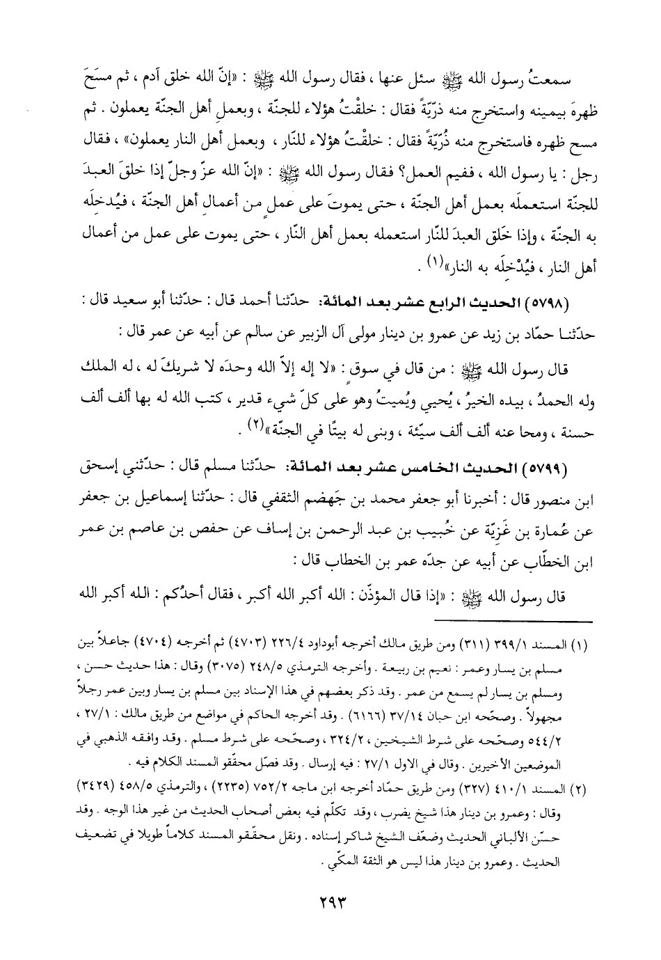 (٢) المسند ١/ ٤١٠ (٣٢٧) ومن طريق حمّاد أخرجه ابن ماجه ٢/ ٧٥٢ (٢٢٣٥)، والترمذي ٥/ ٤٥٨ (٣٤٢٩) وقال: وعمرو بن دينار هذا شيخ يضرب، وقد تكلّم فيه بعض أصحاب الحديث من غير هذا الوجه. وقد حسّن الألباني الحديث وضعّف الشيخ شاكر إسناده. ونقل محقّقو المسند كلامًا طويلا في تضعيف الحديث. وعمرو بن دينار هذا ليس هو الثقة المكّي.