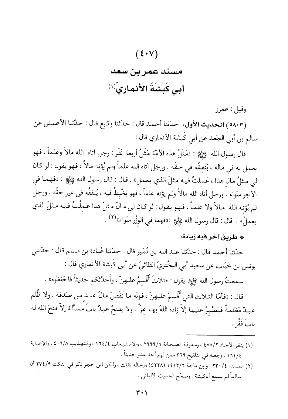 (٢) المسند ٤/ ٢٣٠. وابن ماجة ٢/ ١٤١٣ (٤٢٢٨) ورجاله ثقات، ولكن ابن حجر ذكر في النكت ٩/ ٢٧٤ أن سالمًا لم يسمع أبا كبشة. وصحّح الحديث الألباني.