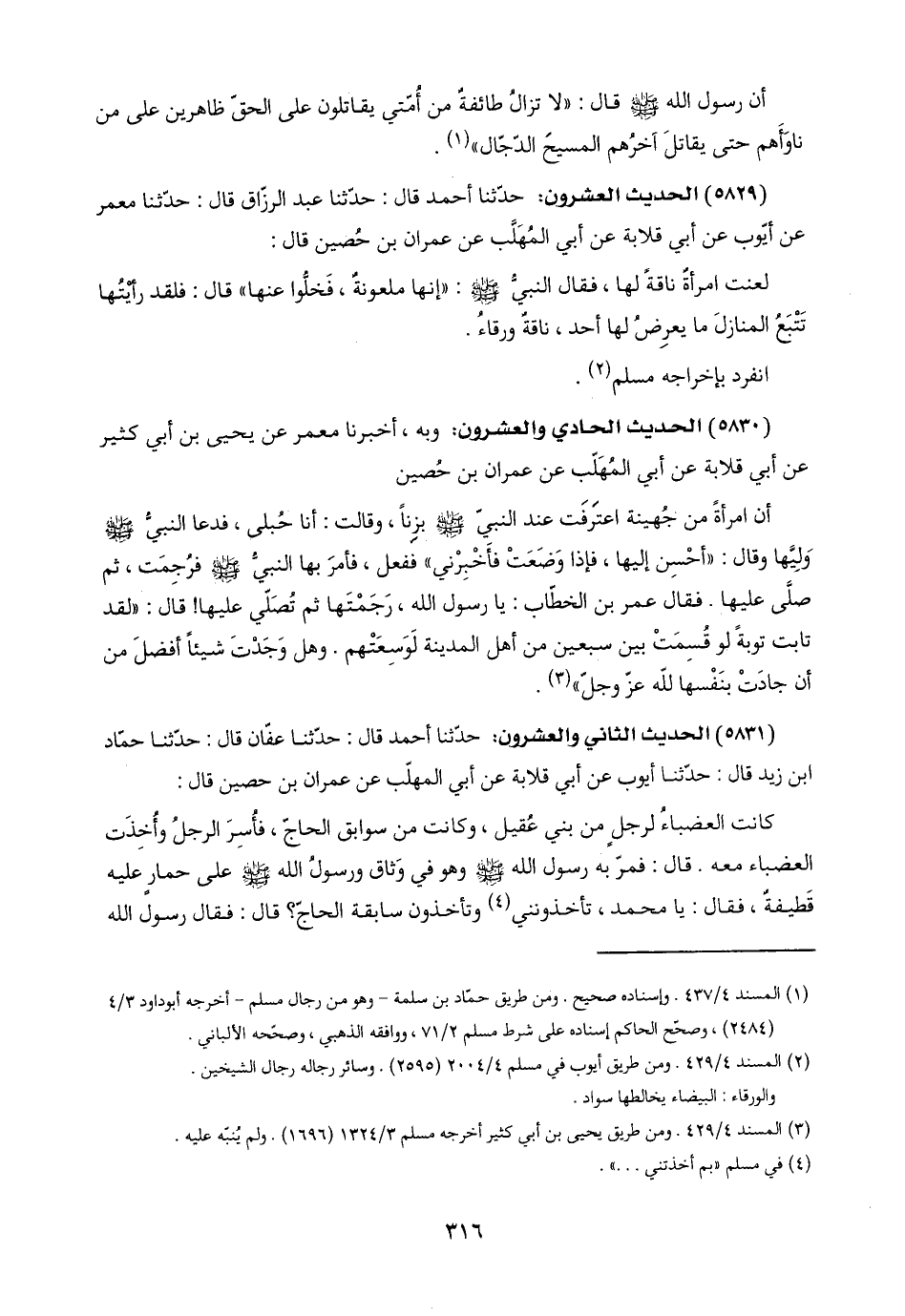 (٥٨٣١) الحديث الثاني والعشرون: حدّثنا أحمد قال: حدّثنا عفّان قال: حدّثنا حمّاد ابن زيد قال: حدّثنا أيوب عن أبي قلابة عن أبي المهلّب عن عمران بن حصين قال: