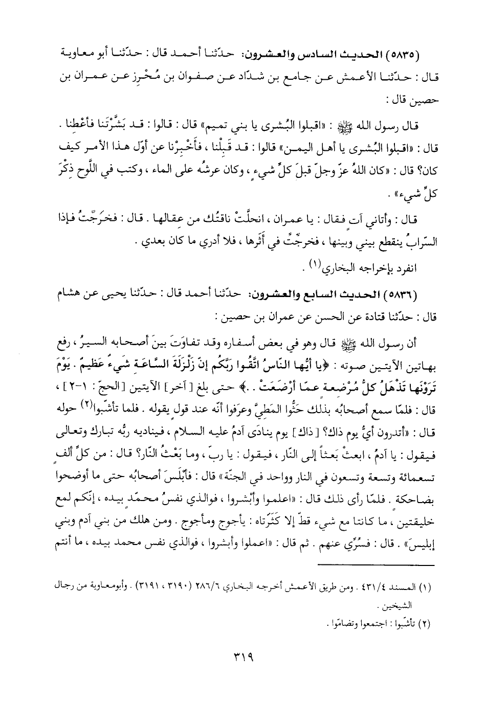(٥٨٣٥) الحديث السادس والعشرون: حدّثنا أحمد قال: حدّثنا أبو معاوية قال: حدّثنا الأعمش عن جامع بن شدّاد عن صفوان بن مُحْرِز عن عمران بن حصين قال: