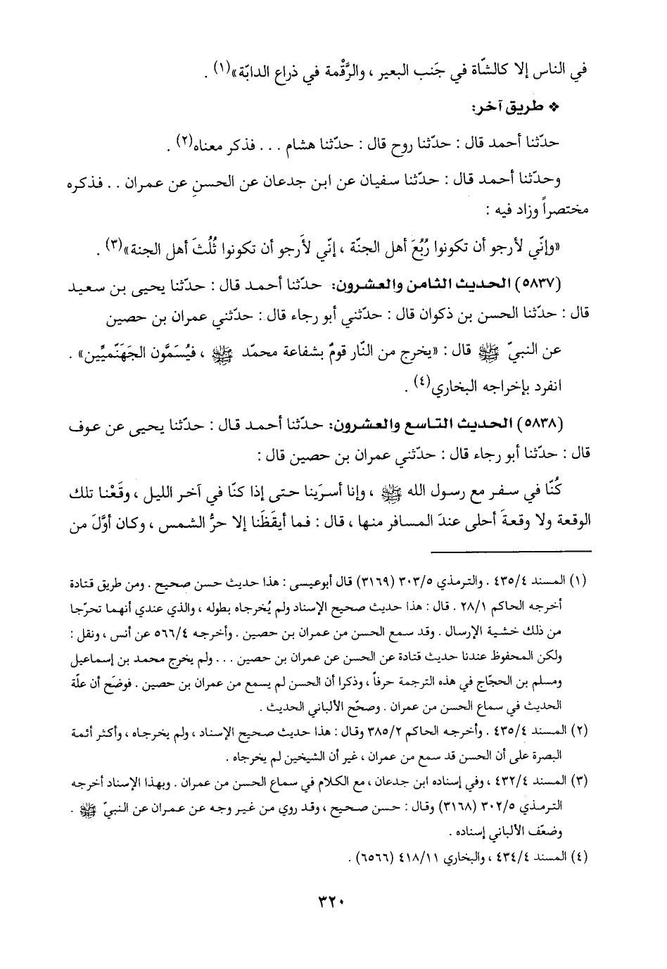 (٥٨٣٧) الحديث الثامن والعشرون: حدّثنا أحمد قال: حدّثنا يحيى بن سعيد قال: حدّثنا الحسن بن ذكوان قال: حدّثني أبو رجاء قال: حدّثني عمران بن حصين: