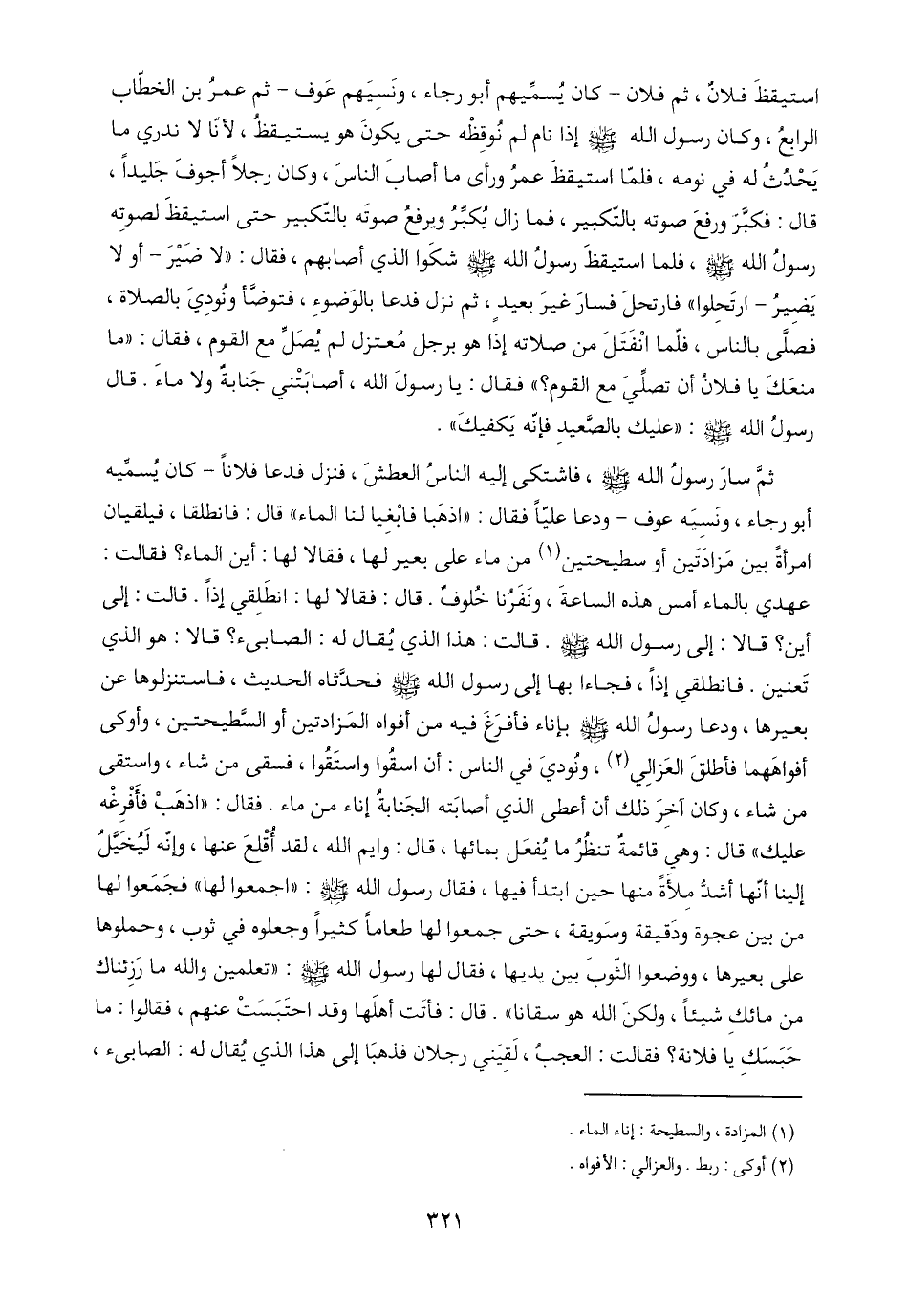 ثمَّ سارَ رسولُ اللَّه -صلى اللَّه عليه وسلم-، فاشتكى إليه الناسُ العطشَ، فنزل فدعا فلانًا -كان يُسمِّيه أبو رجاء، ونَسِيَه عوف- ودعا عليًّا فقال: "اذهَبا فابْغِيا لنا الماء" قال: فانطلقا، فيلقيان امرأةً بين مَزادَتَين أو سطيحتين (١) من ماء على بعير لها، فقالا لها: أين الماء؟ فقالت: عهدي بالماء أمس هذه الساعةَ، ونَفَرُنا خُلوفٌ. قال: فقالا لها: انطَلِقي إذًا. قالت: إلى أين؟ قالا: إلى رسول اللَّه -صلى اللَّه عليه وسلم-. قالت: هذا الذي يُقال له: الصابىء؟ قالا: هو الذي تَعنين. فانطلقي إذًا، فجاءا بها إلى رسول اللَّه -صلى اللَّه عليه وسلم- فحدَّثاه الحديث، فاستنزلوها عن بعيرها، ودعا رسولُ اللَّه -صلى اللَّه عليه وسلم- بإناء فأفرَغَ فيه من أفواه المَزادتين أو السَّطيحتين، وأوكى أفواهَهما فأطلقَ العَزالِي (٢)، ونُوديَ في النّاس: أن اسقُوا واستَقُوا، فسقى من شاء، واستقى من شاء، وكان آخِرَ ذلك أن أعطى الذي أصابَته الجَنابةُ إناء من ماء. فقال: "اذهَبْ فأَفْرِغْه عليك" قال: وهي قائمةٌ تنظُرُ ما يُفعَل بمائها، قال: وايم اللَّه، لقد أُقْلعَ عنها، وإنّه لَيُخَيَّلُ إلينا أنّها أشدُّ مِلأَةً منها حين ابتدأ فيها، فقال رسول اللَّه -صلى اللَّه عليه وسلم-: "اجمعوا لها"، فجَمَعوا لها من بين عجوة ودَقيقة وسَويقة، حتى جمعوا لها طعامًا كثيرًا وجعلوه في ثوب، وحملوها على بعيرها، ووضعوا الثّوبَ بين يديها، فقال لها رسول اللَّه -صلى اللَّه عليه وسلم-: "تعلمين واللَّه ما رَزِئناك من مائكِ شيئًا، ولكنّ اللَّه هو سقانا". قال: فأتَت أهلَها وقد احتَبَسَتْ عنهم، فقالوا: ما حَبَسَكِ يا فلانة؟ فقال: العجبُ، لَقِيَني رجلان فذهبَا إلى هذا الذي يُقال له: الصابىء،