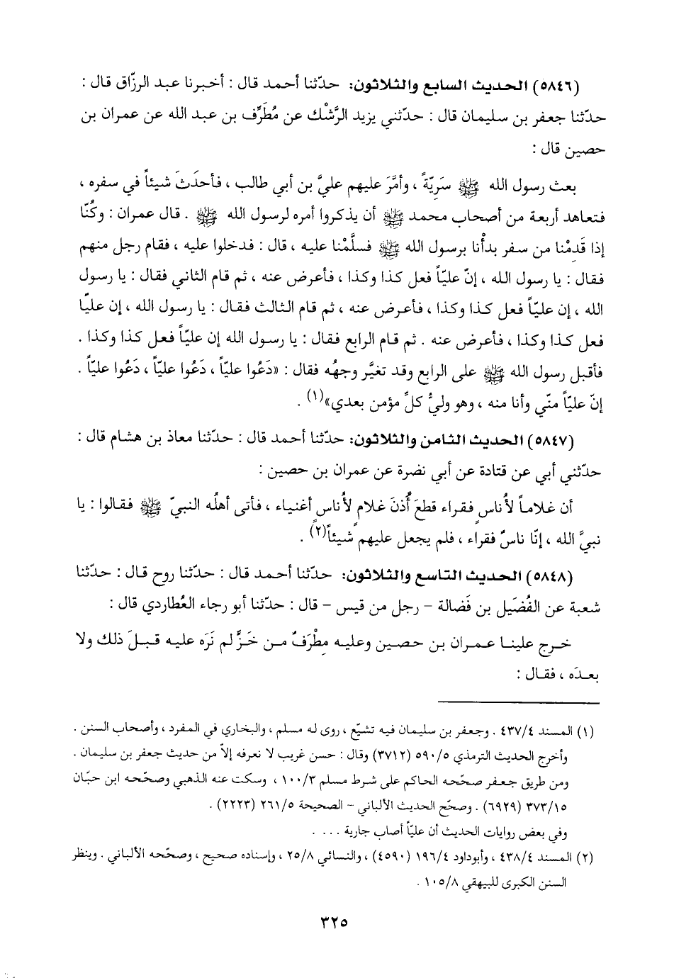 (٥٨٤٦) الحديث السابع والثلاثون: حدّثنا أحمد قال: أخبرنا عبد الرزّاق قال: حدّثنا جعفر بن سليمان قال: حدّثني يزيد الرَّشْك عن مُطَرّف بن عبد اللَّه عن عمران بن حصين قال: