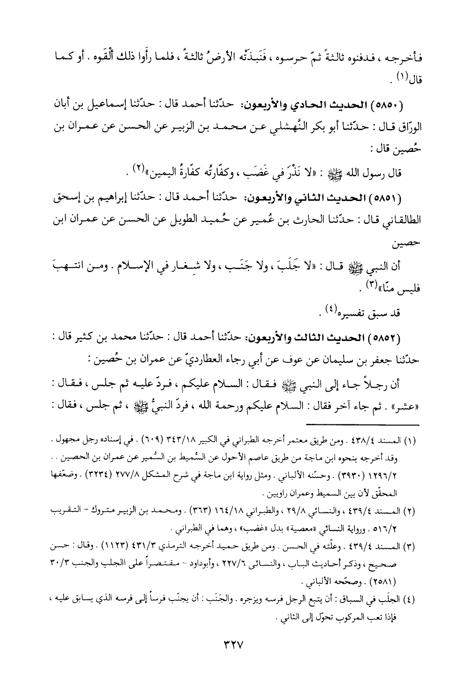 (٥٨٥١) الحديث الثاني والأربعون: حدّثنا أحمد قال: حدّثنا إبراهيم بن إسحق الطالقاني قال: حدّثنا الحارث بن عُمير عن حُميد الطويل عن الحسن عن عمران ابن حصين: