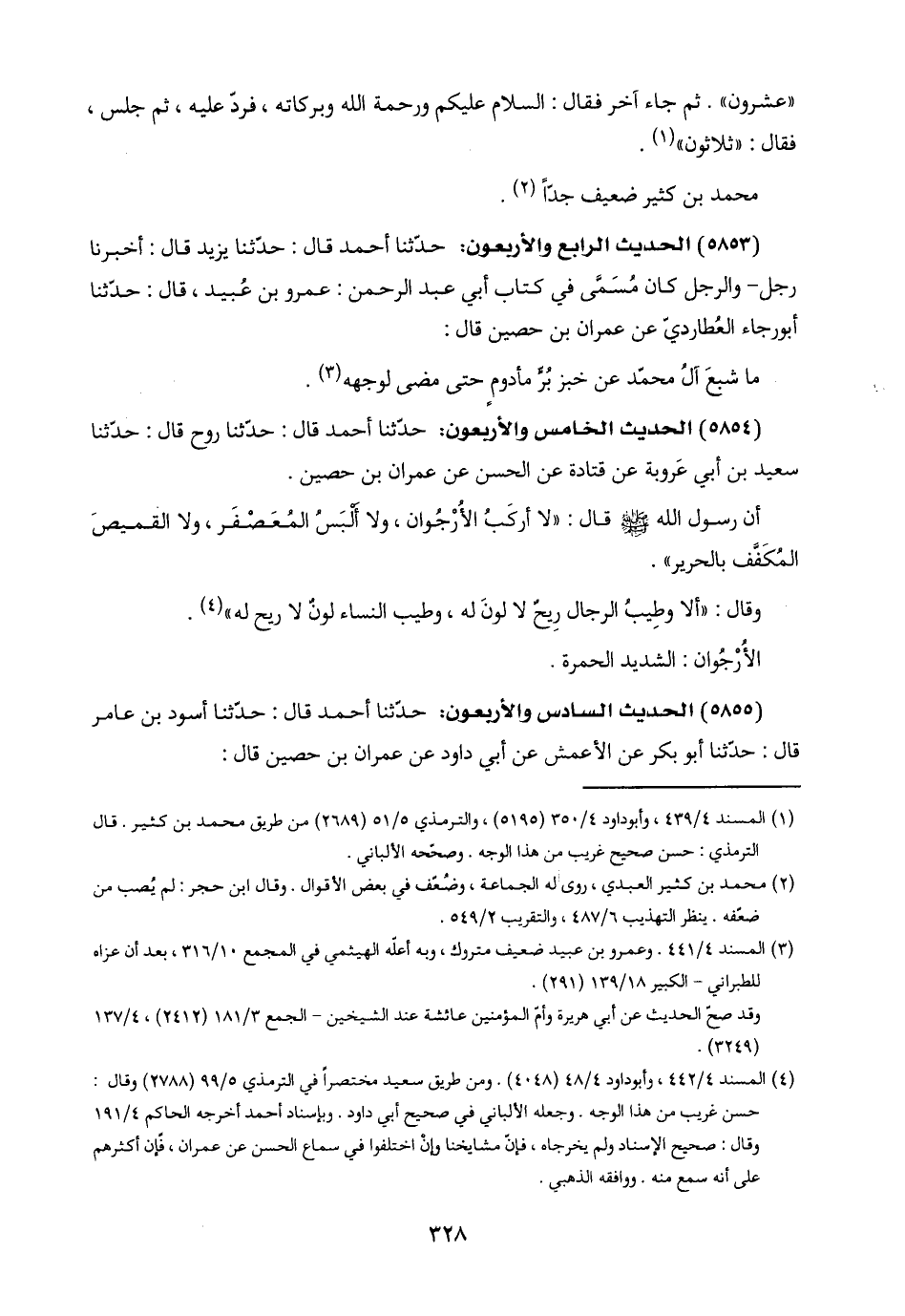(٥٨٥٣) الحديث الرابع والأربعون: حدّثنا أحمد قال: حدّثنا يزيد قال: أخبرنا رجل - والرجل كان مُسَمَّى في كتاب أبي عبد الرحمن: عمرو بن عُبيد، قال: حدّثنا أبو رجاء العُطارديّ عن عمران بن حصين قال: