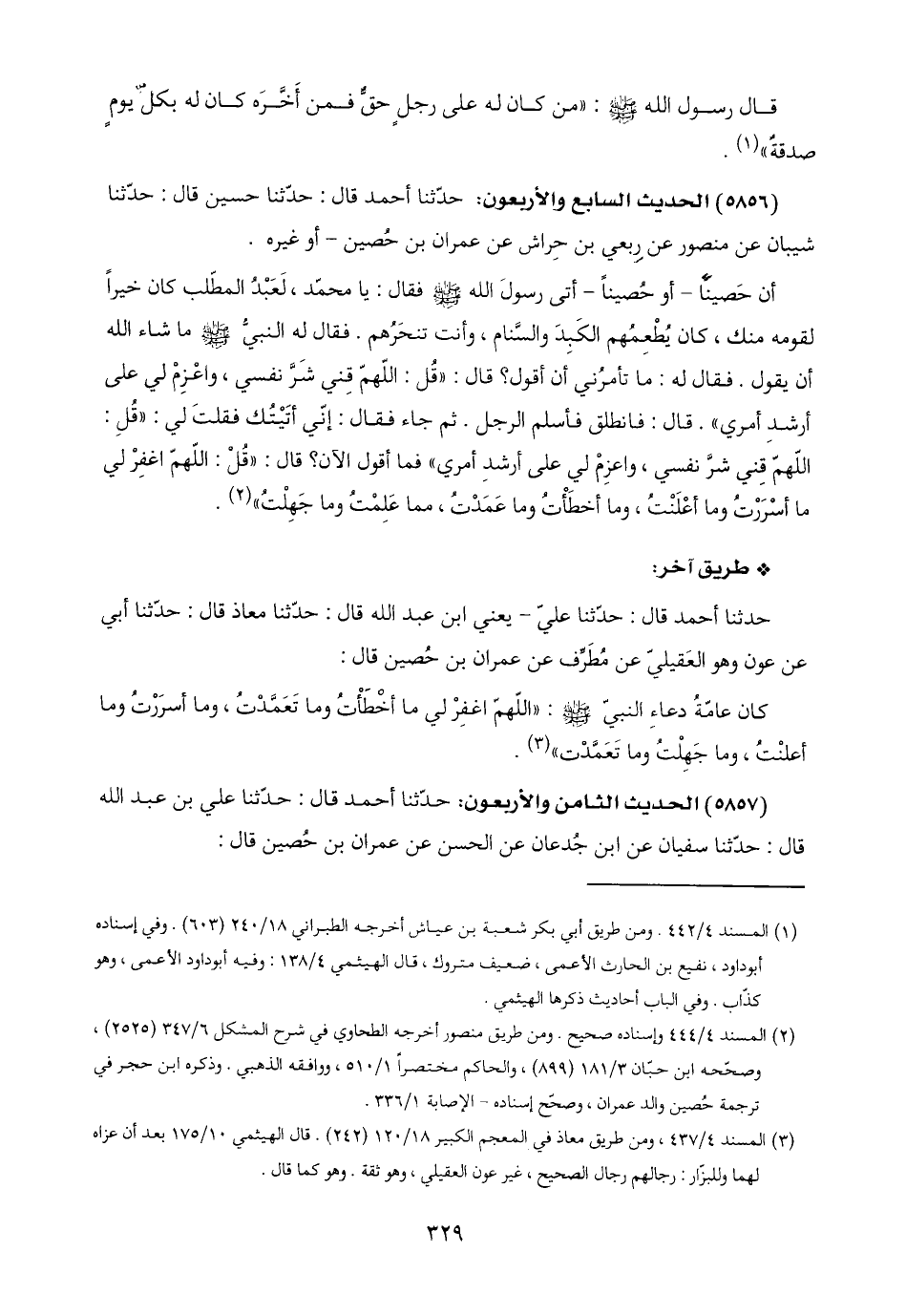 (٥٨٥٦) الحديث السابع والأربعون: حدّثنا أحمد قال: حدّثنا حسين قال: حدّثنا شيبان عن منصور عن رِبعي بن حِراش عن عمران بن حُصين - أو غيره.