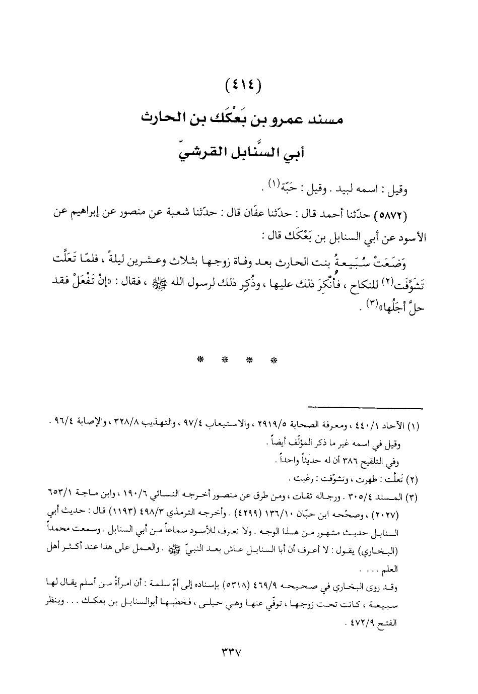 (٥٨٧٢) حدّثنا أحمد قال: حدّثنا عفّان قال: حدّثنا شعبة عن منصور عن إبراهيم عن الأسود عن أبي السنابل بن بَعْكَك قال: