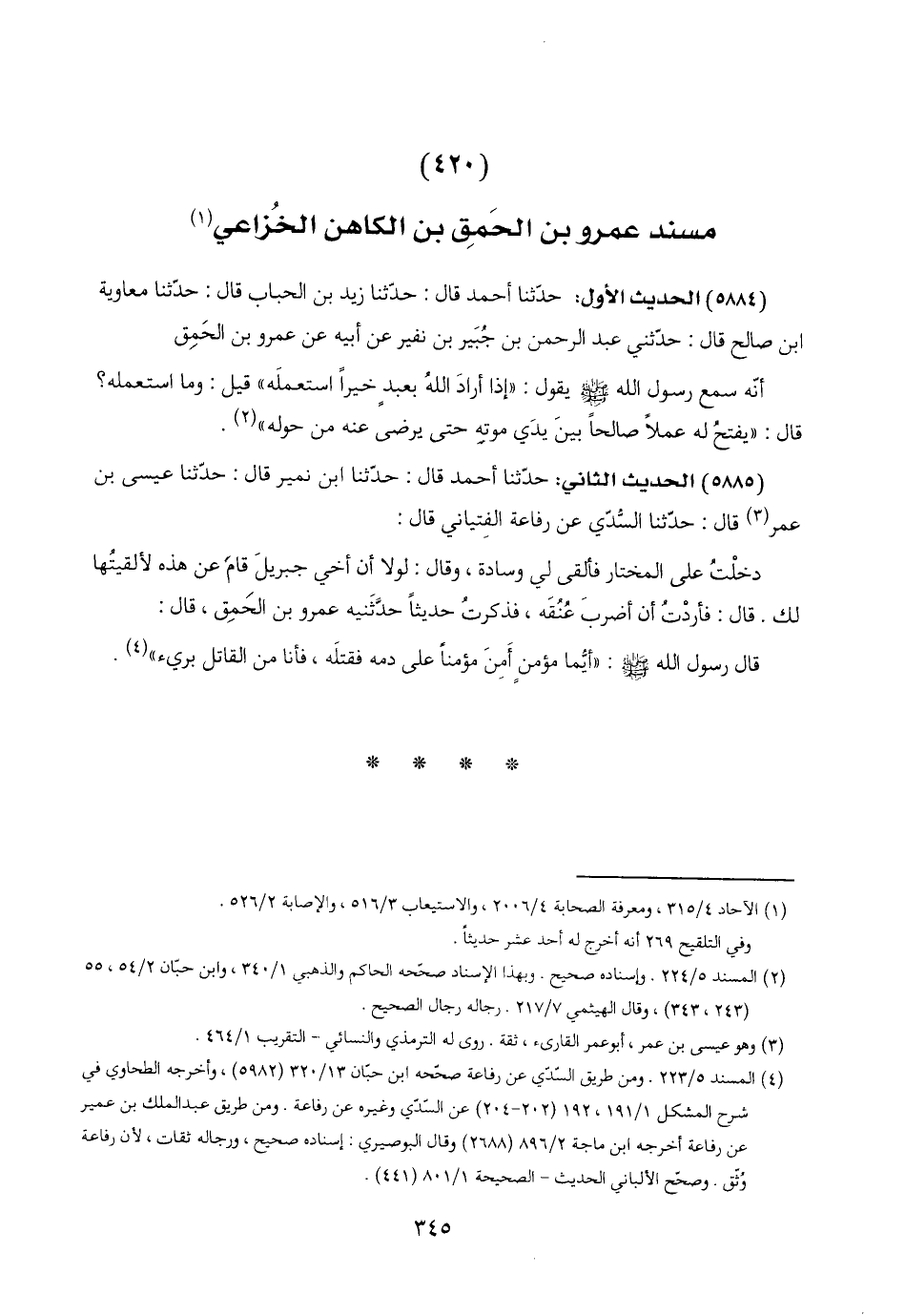 (٥٨٨٤) الحديث الأول: حدّثنا أحمد قال: حدّثنا زيد بن الحباب قال: حدّثنا معاوية ابن صالح قال: حدّثني عبد الرحمن بن جُبَير بن نفير عن أبيه عن عمرو بن الحَمِق: