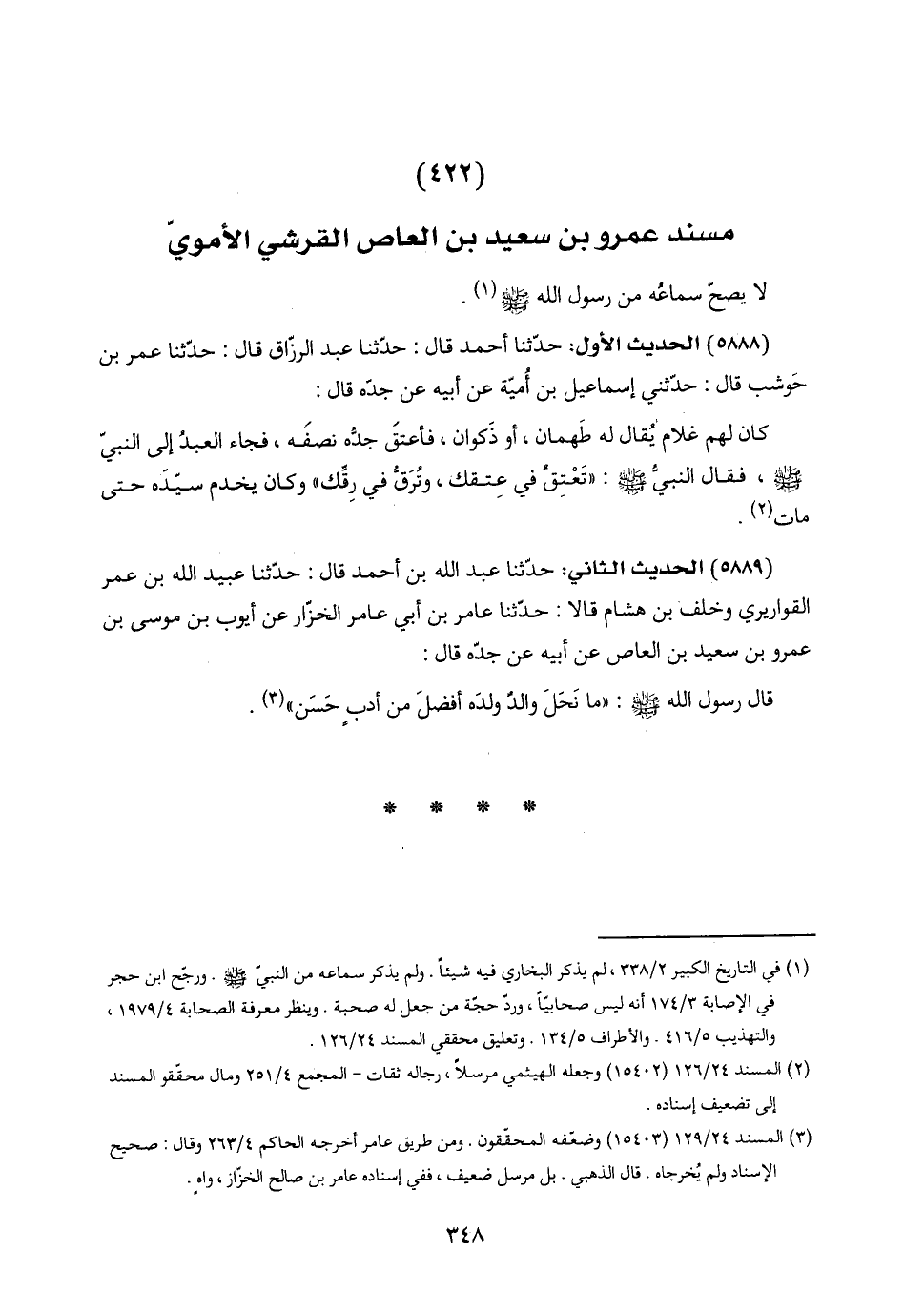 (٤٢٢) مسند عمرو بن سعيد بن العاص القرشي الأمويّ