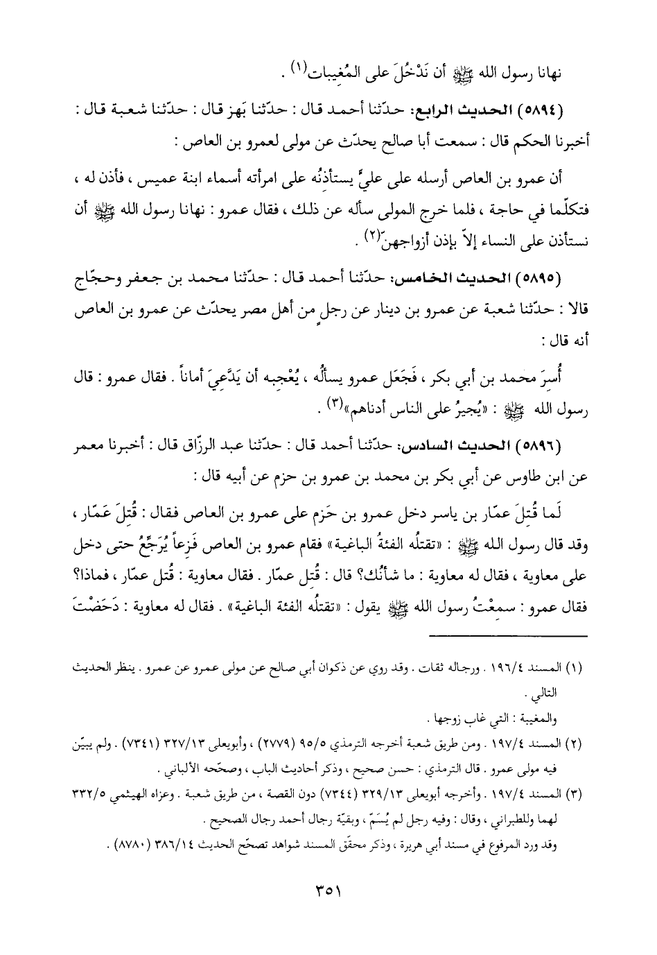 (٥٨٩٤) الحديث الرابع: حدّثنا أحمد قال: حدّثنا بَهز قال: حدّثنا شعبة قال: أخبرنا الحكم قال: سمعت أبا صالح يحدّث عن مولى لعمرو بن العاص: