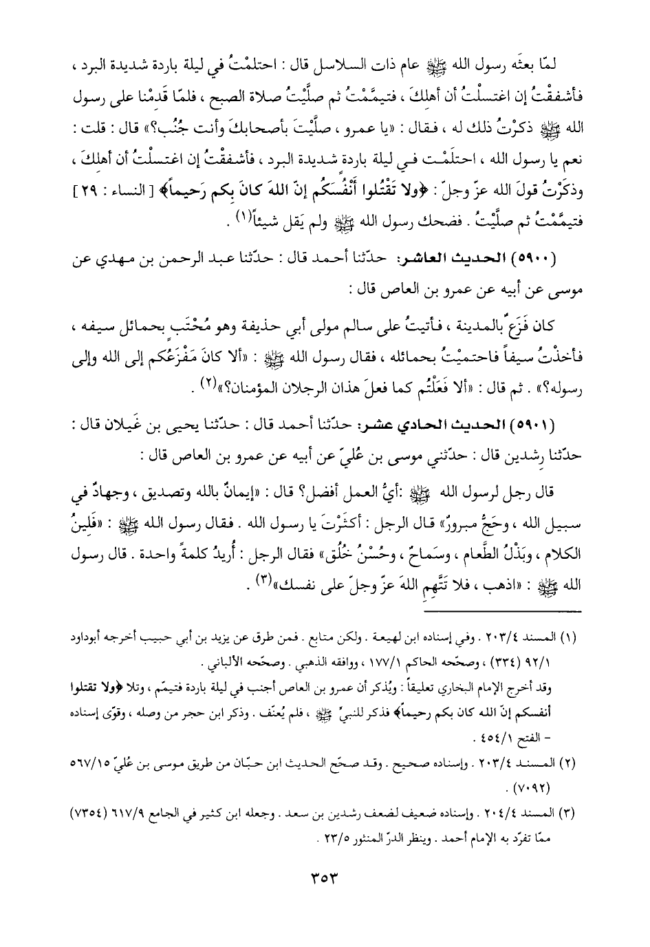 وقد أخرج الإمام البخاري تعليقًا: ويُذكر أن عمرو بن العاص أجنب في ليلة باردة فتيمّم، وتلا {وَلَا تَقْتُلُوا أَنْفُسَكُمْ إِنَّ اللَّهَ كَانَ بِكُمْ رَحِيمًا} فذكر للنبيِّ -صلى اللَّه عليه وسلم-، فلم يُعنّف. وذكر ابن حجر من وصله، وقوّى إسناده - الفتح ١/ ٤٥٤.