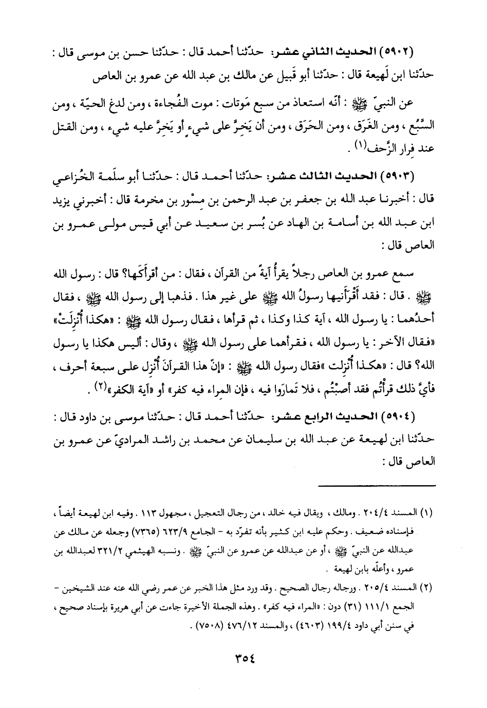 (٥٩٠٢) الحديث الثاني عشر: حدّثنا أحمد قال: حدّثنا حسن بن موسى قال: حدّثنا ابن لَهيعة قال: حدّثنا أبو قَبيل عن مالك بن عبد اللَّه عن عمرو بن العاص: