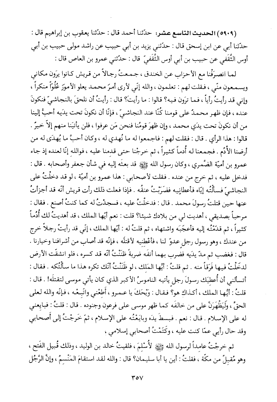 لما انصرَفْنا مع الأحزاب عن الخندق، جمعتُ رجالًا من قريش كانوا يرَون مكاني ويسمعون منّي، فقلت لهم: تعلمون، واللَّه إنّي لأرى أمرَ محمد يعلو الأموَر عُلُوًّا منكرًا، وإني قد رأيتُ رأيًا، فما ترَون فيه؟ قالوا: ما رأيتَ؟ قال: رأيتُ أن نلحقَ بالنجاشيّ فنكونَ عنده، فإن ظهر محمدٌ على قومنا كُنّا عند النجاشيّ، فإنّا أن نكونَ تحت يدَيه أحبُّ إلينا من أن نكونَ تحت يدَي محمد، وإن ظهرَ قومُنا فنحن مَن عرفوا، فلن يأتيَنا منهم إلّا خيرٌ. قالوا: هذا الرأي. قال: فقلت لهم: فاجمعو له ما نُهدي له، وكان أحبَّ ما يُهدَى له من أرضنا الأدُم. فجمعنا له أدمًا كثيرًا، ثم خرجْنا حتى قدِمنا عليه، فواللَّهِ إنّا لعنده إذ جاء عمرو بن أميّة الضَّمري، وكان رسول اللَّه -صلى اللَّه عليه وسلم- قد بعثَه إليه في شأن جعفر وأصحابه. قال: فدخل عليه، ثم خرج من عنده. فقلت لأصحابي: هذا عمرو بن أميّة، لو قد دخلْتُ على النجاشي فسألْتُه إيّاه فأعطانيه فضَربْتُ عنقُه. فإذا فعلت ذلك رأت قريش أنّه قد أجزأتُ عنها حين قتلتُ رسولَ محمد. قال: فدخلْتُ عليه، فسجدْتُ له كما كنتُ أصنع. فقال: مرحبًا بصديقي، أهديت لي من بلادك شيئًا؟ قلت: نعم أيّها الملك، قد أهديتُ لك أُدُمًا كثيرًا، ثم قدّمْته إليه فأعجَبَه واشتهاه، ثم قلتُ له: أيّها الملك، إنّي قد رأيتُ رجلًا خرج من عندك، وهو رسول رجلٍ عدوّ لنا، فأعْطِنِيه لأقتلَه، فإنّه قد أصاب من أشرافنا وخيارنا. قال: فغضب ثم مدّ يدَيه فضرب بهما أنفَه ضربةً ظنَنْتُ أنّه قد كسره، فلو انشقّت الأرض لدخَلْتُ فيها فَرَقًا منه. ثم قلتُ: أيُّها المَلِك، لو ظَنَنْتُ أنّك تكره هذا ما سألْتُكه. فقال: أتسألني أن أُعطِيَك رسولَ رجلٍ يأتيه الناموسُ الأكبر الذي كان يأتي موسى لتقتلَه! . قال: قلتُ: أيّها الملك، أكذاك هو؟ فقال: ويْحَكَ يا عمرو، أَطِعْني واتّبِعْه، فإنّه واللَّه لعلى الحقِّ، وَليَظْهَرَنَّ على من خالفَه كما ظهر موسى على فرعون وجنوده. قال: قلتُ: فبايعني له على الإسلام. قال: نعم. فبسطَ يدَه وبايَعْتُه على الإسلام، ثمّ خَرجْتُ إلى أَصحابي وقد حال رأيي عمّا كنت عليه، وكَتَمْتُ أصحابي إسلامي.