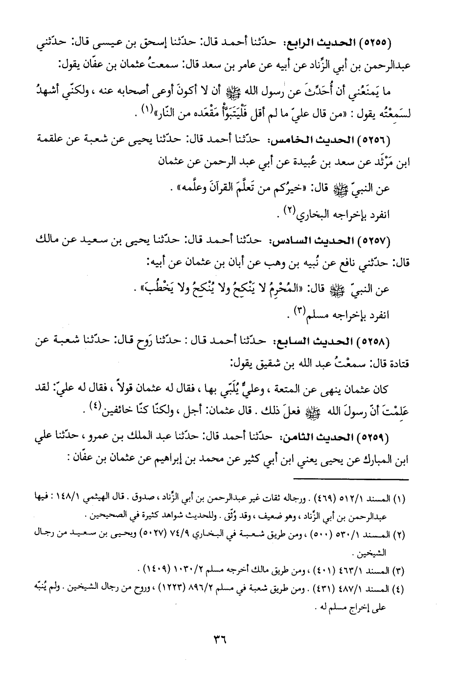 (٥٢٥٥) الحديث الرابع: حدّثنا أحمد قال: حدّثنا إسحق بن عيسى قال: حدّثني عبد الرحمن بن أبي الزِّناد عن أبيه عن عامر بن سعد قال: سمعتُ عثمان بن عفّان يقول:
