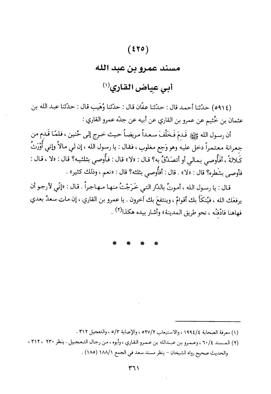 (٢) المسند ٤/ ٦٠، وعمرو بن عبد اللَّه بن عمرو القاري، وأبوه، من رجال التعجيل. ينظر ٢٣٠، ٣١٢، والحديث صحيح رواه الشيخان - ينظر مسند سعد في الجمع ١/ ١٨٨ (١٨٥).