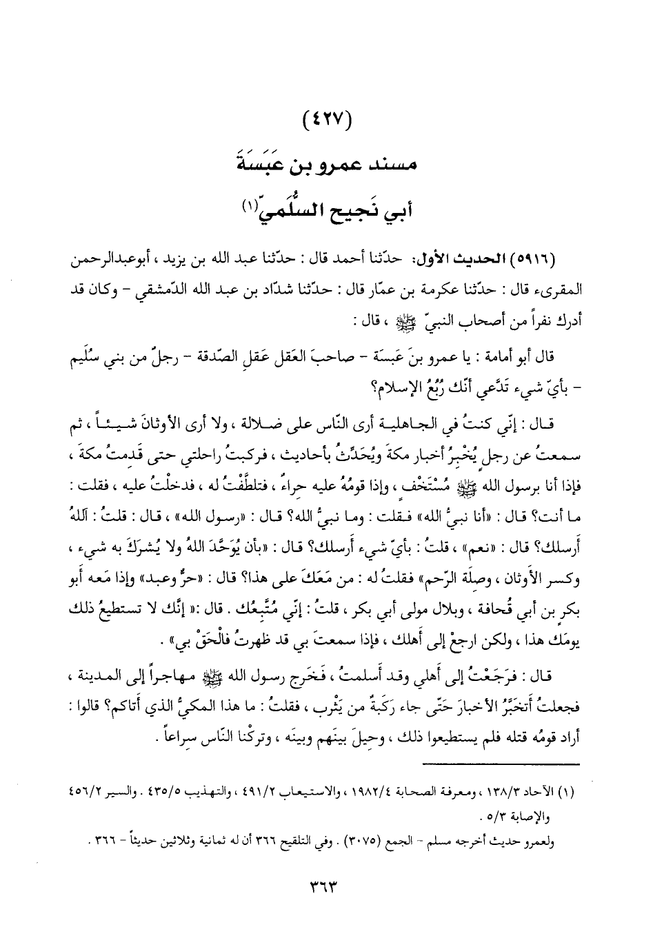 (٤٢٧) مسند عمرو بن عَبَسَةَ أبي نَجيح السُّلَميّ (١)