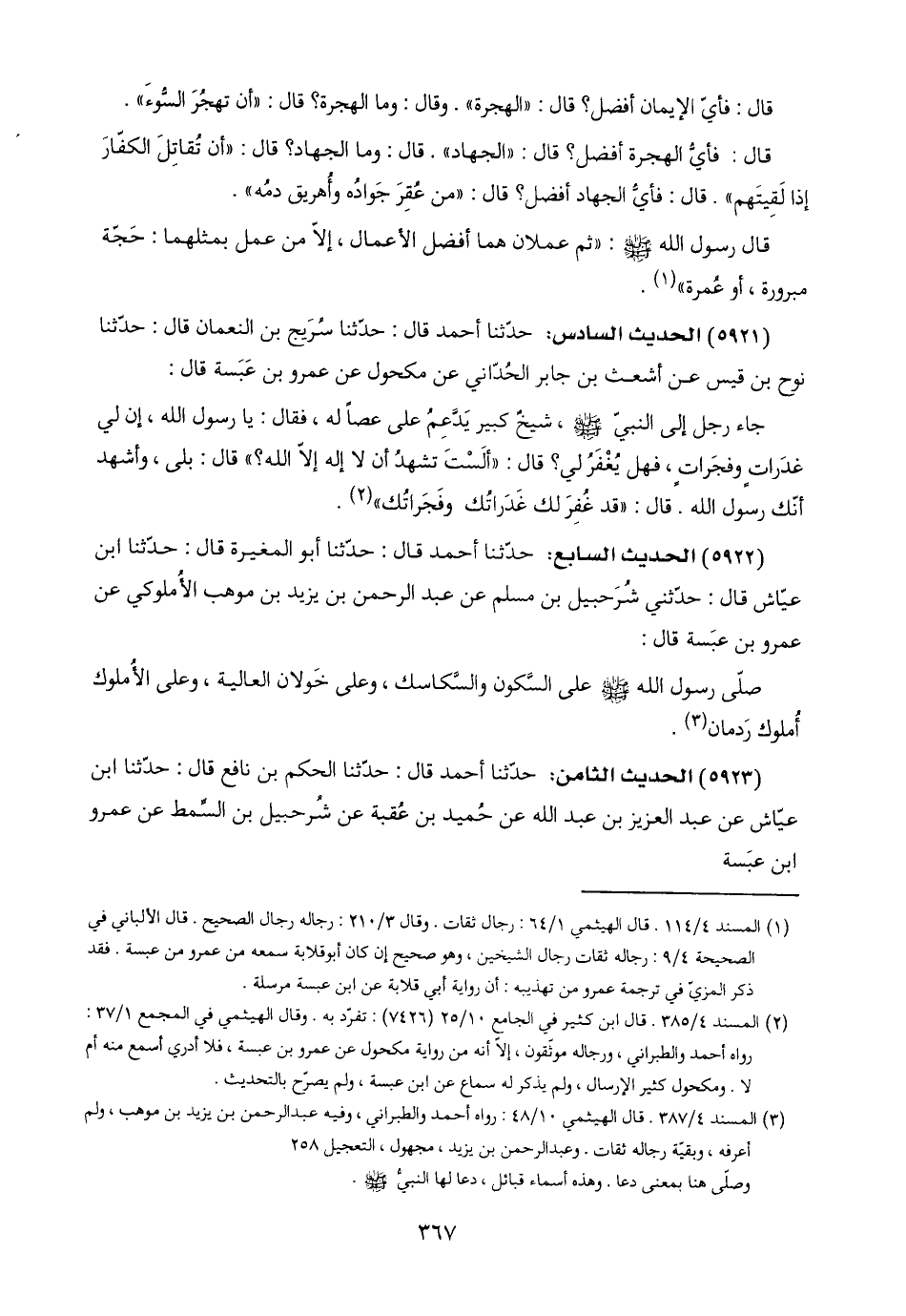 (٥٩٢٣) الحديث الثامن: حدّثنا أحمد قال: حدّثنا الحكم بن نافع قال: حدّثنا ابن عيّاش عن عبد العزيز بن عبد اللَّه عن حُميد بن عُقبة عن شُرحبيل بن السِّمط عن عمرو ابن عبَسة: