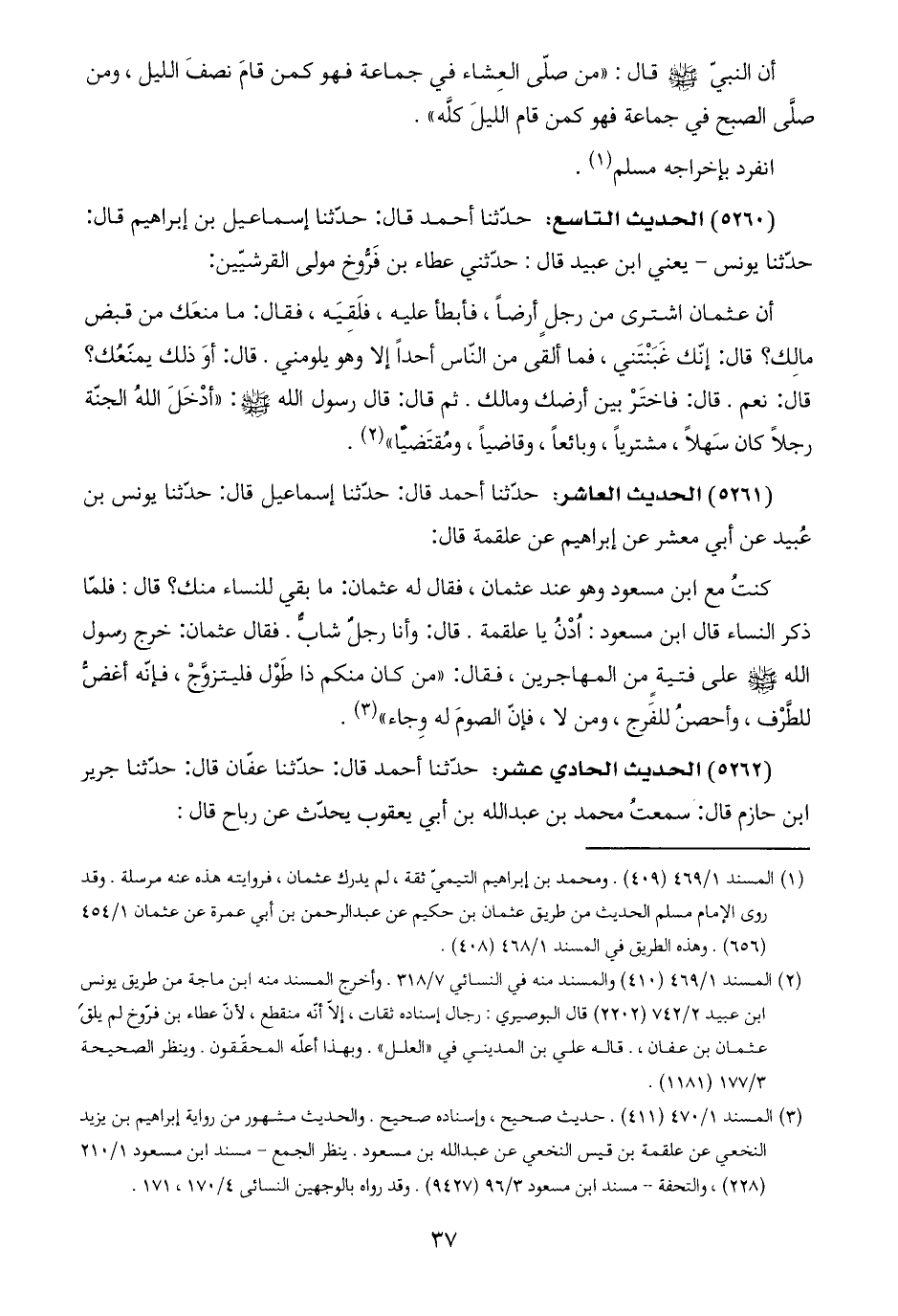 (١) المسند ١/ ٤٦٩ (٤٠٩). ومحمد بن إبراهيم التيميّ ثقة، لم يدرك عثمان، فروايته هذه عنه مرسلة. وقد روى الإمام مسلم الحديث من طريق عثمان بن حكيم عن عبد الرحمن بن أبي عمرة عن عثمان ١/ ٤٥٤ (٦٥٦). وهذه الطريق في المسند ١/ ٤٦٨ (٤٠٨).