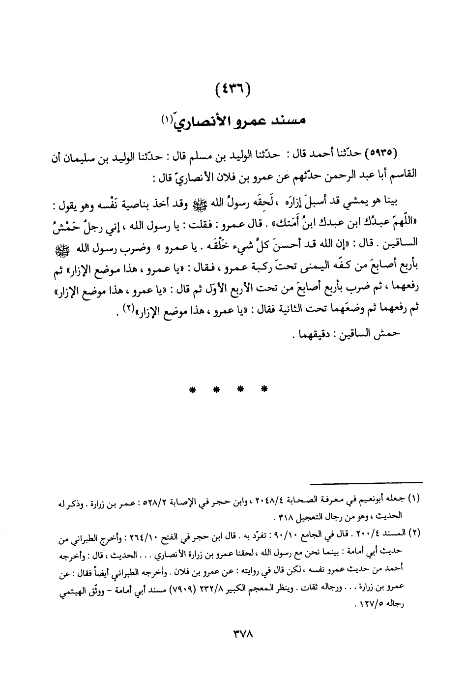 بينا هو يمشي قد أسبلَ إزارَه، لَحِقَه رسولُ اللَّه -صلى اللَّه عليه وسلم- وقد أخذ بناصية نَفْسه وهو يقول: "اللهمّ عبدُك ابن عبدك ابنُ أَمَتك". قال عمرو: فقلت: يا رسول اللَّه، إني رجلٌ حَمْشُ الساقين. قال: "إنّ اللَّه قد أحسنَ كلَّ شيء خَلْقَه. يا عمرو" وضرب رسول اللَّه -صلى اللَّه عليه وسلم- بأربع أصابعَ من كفّه اليمنى تحتَ ركبة عمرو، فقال: "يا عمرو، هذا موضع الإزار" ثم رفعهما، ثم ضرب بأربع أصابع من تحت الأربع الأوّل ثم قال: "يا عمرو، هذا موضع الإزار" ثم رفعهما ثم وضعّهما تحت الثانية فقال: "يا عمرو، هذا موضع الإزار" (٢).