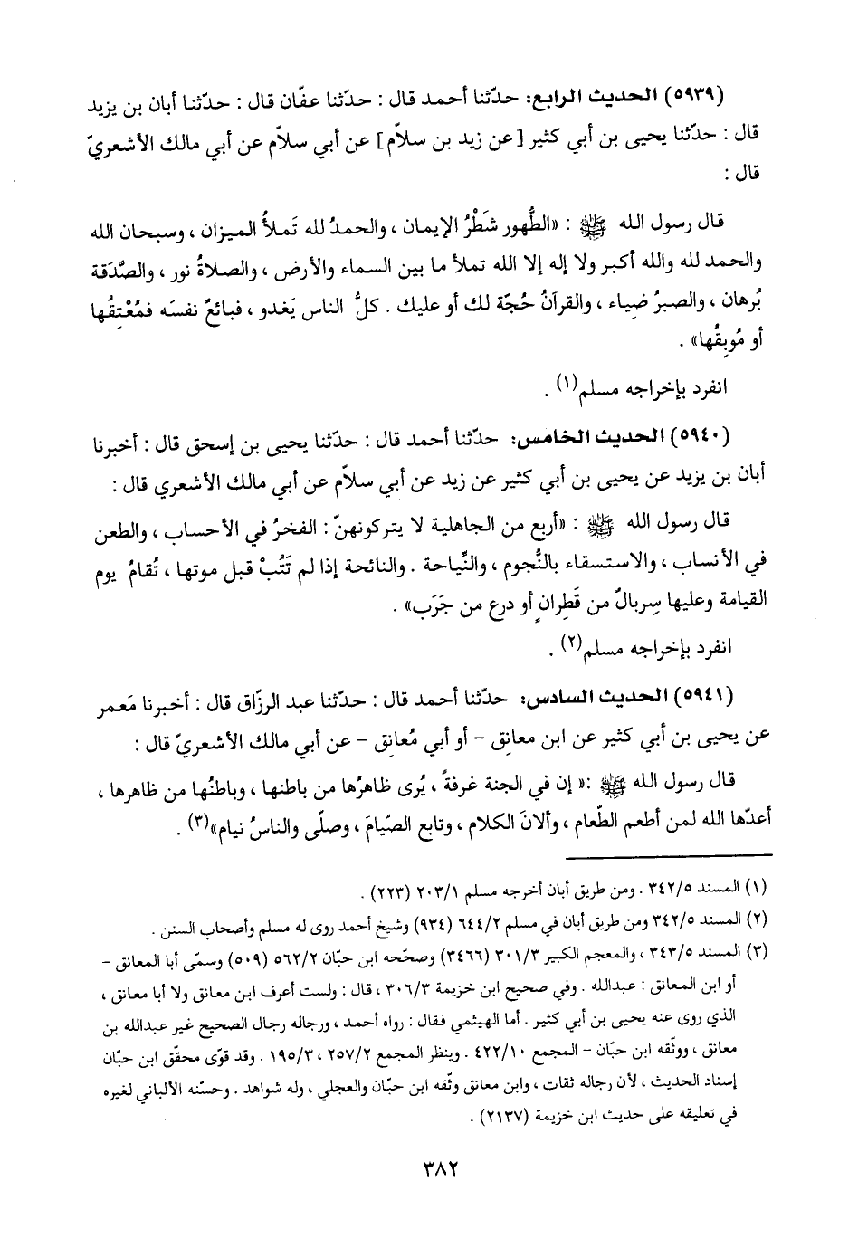 (٥٩٣٩) الحديث الرابع: حدّثنا أحمد قال: حدّثنا عفّان قال: حدّثنا أبان بن يزيد قال: حدّثنا يحيى بن أبي كثير [عن زيد بن سلّام] عن أبي سلّام عن أبي مالك الأشعريّ قال: