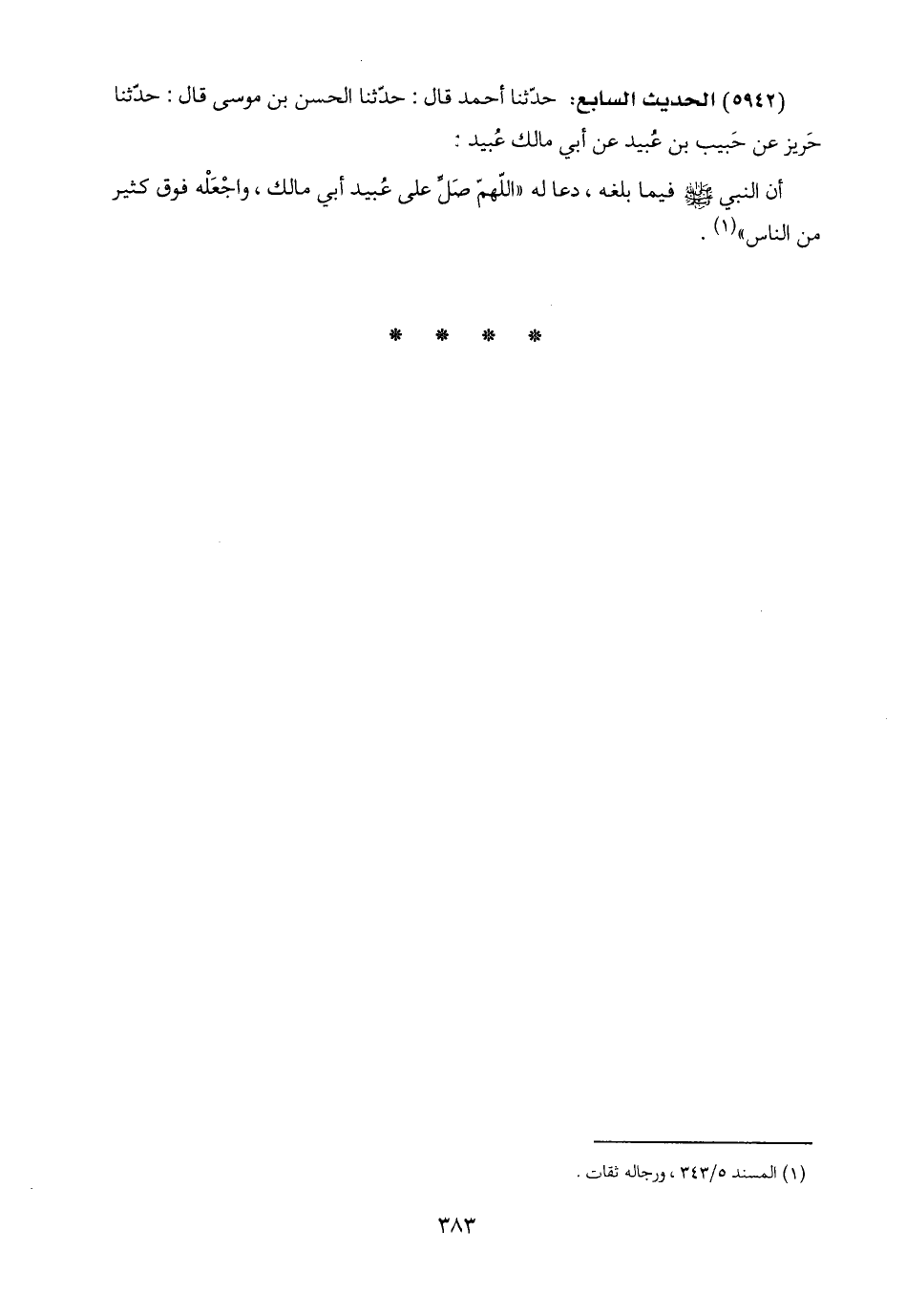 (٥٩٤٢) الحديث السابع: حدّثنا أحمد قال: حدّثنا الحسن بن موسى قال: حدّثنا حَريز عن حَبيب بن عُبيد عن أبي مالك عُبيد: