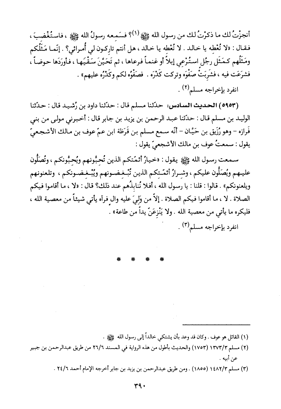 (٥٩٥٣) الحديث السادس: حدّثنا مسلم قال: حدّثنا داود بن رُشيد قال: حدّثنا الوليد بن مسلم قال: حدّثنا عبد الرحمن بن يزيد بن جابر قال: أخبرني مولى من بني فَرازه -وهو رُزَيق بن حَيَّان- أنّه سمع مسلم بن قَرَظة ابن عمّ عوف بن مالك الأشجعيّ يقول: سمعتُ عوف بن مالك الأشجعيّ يقول: