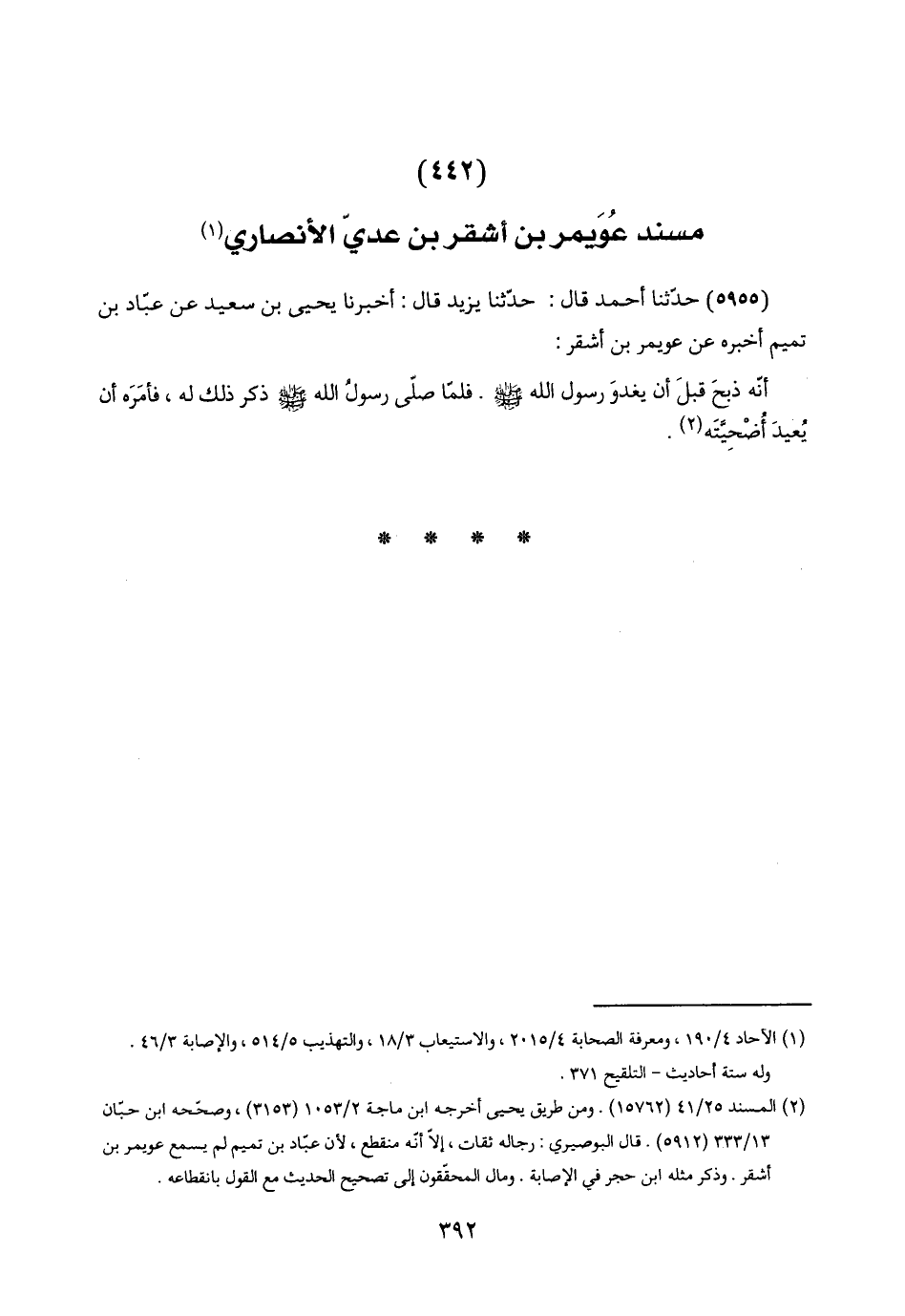(٢) المسند ٢٥/ ٤١ (١٥٧٦٢). ومن طريق يحيى أخرجه ابن ماجة ٢/ ١٠٥٣ (٣١٥٣)، وصحّحه ابن حبّان ١٣/ ٣٣٣ (٥٩١٢). قال البوصيري: رجاله ثقات، إلّا أنّه منقطع، لأن عبّاد بن تميم لم يسمع عويمر بن أشقر. وذكر مثله ابن حجر في الإصابة. ومال المحقّقون إلى تصحيح الحديث مع القول بانقطاعه.